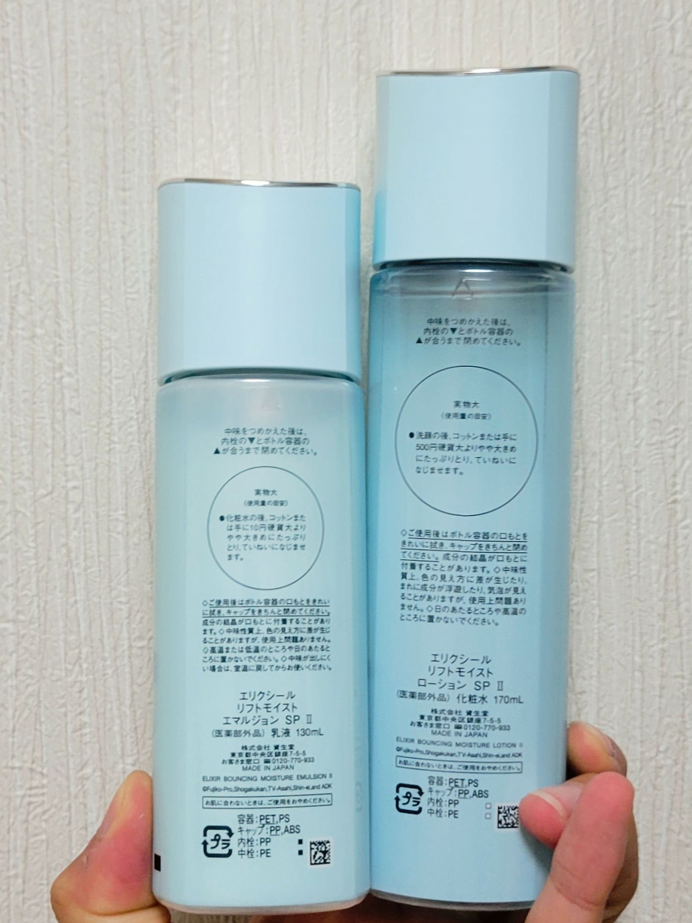エリクシールリフトモイストドラえもんコラボ今年もエリクシールからドラえもんコラボ商品が発売されました!ドラえもんがしずかとノビスケを優しく見守っているイラストで、見ているとこちらも優しい気持ちになれますね。去年もコラボしてくれて、そのときからずっとエリクシールを使っているので引き続きエリクシールのお世話になりそうです。1年ほど使い続けていますので、使用感も含めてレビューしたいと思います。◾️リフトモイストローション(化粧水)フローラル調の香りですが、エタノールの香りも少しするのでもしかしたら苦手な人もいるかもしれません。私はアレルギー体質で、強い香りを嗅ぐとくしゃみや鼻水が出てしまうのですが、エリクシールはそういったことがないです。エリクシールは3種のテクスチャの中から自分の好きなものを選ぶことができるのですが、私は2番のしっとりタイプを使っています。少しとろみがあって、手に出したときにこぼれにくくムダにならないところが地味に高評価です。アレルギーテスト済みとのことで、敏感肌の私でもかゆみや刺激は感じていません。◾️リフトモイストエマルジョン(乳液)公式では、化粧水も乳液もアクアフローラルの香りで同じなのですが、化粧水より香りは穏やかでどちらかというとハーバル調の香りだと感じます。こちらはエタノールが含まれていないのでエタノールの香りはしません。◾️1年ほど使い続けてきた感想スキンケア後の吸いつくような肌が気持ち良いです。そしてこのもっちり感が夕方まで持続します。元々脂性肌ではあるのですが、冬でも乾燥を感じたことはありません。エリクシールを使う前は、ファンデーションの毛穴落ちに悩んでいたのですが、エリクシールを使い始めてから、私の肌ではほとんど毛穴落ちしなくなりました。季節の変わり目や夏はニキビができることがありますが、それ以外では肌荒れもせず、大変満足しています。◾️その他トラネキサム酸を有効成分とした医薬部外品です。トラネキサム酸は、資生堂が肌荒れ防止成分として厚労省から承認を受け、その後、美白成分として追加承認を受けた成分ですね。肌荒れ防止の効果があるのですが、私は脂性肌のためか、夏に乳液を使うと高頻度でニキビができる傾向があるので、夏だけはTゾーンとアゴは避けて乳液を塗布しています。リフィルを買って、このかわいいボトルが使い続けられるのがすごく嬉しいです!資生堂さん本当にありがとう...!余談ですが、商品名は「リフトモイスト」なのに、ボトルには「BOUNCINGMOISTURE」と印字されているのがけっこう紛らわしいなと前から思っていてどちらかに統一できないのでしょうか...w#エリクシール#リフトモイスト#化粧水#乳液#エイジングケア#ドラえもん