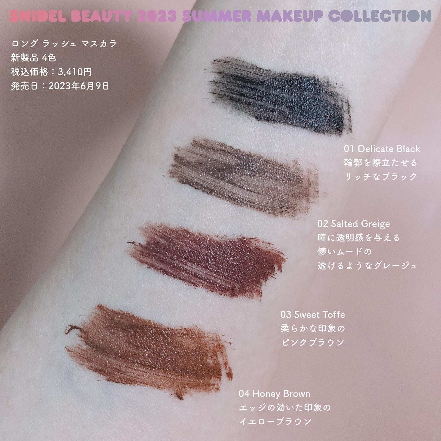 SNIDELBEAUTYSummerMakeupCollectionChasingtheLight2ndPHASE予約開始日:5月26日(金)販売日:6月9日(金)スナイデルビューティの夏の新色第二弾🌞暑気にやられてお化粧そのものが面倒臭くなり色々塗るのが嫌になる夏にピッタリな、単色でも決まる!楽チンかつ艶と煌めきが可愛いクリームシャドウ「ルミナイジングカラーアイズ」と、よく使うのって結局こういう色だよね!!ってなる微細なブラウンの色差に拘ったという「ロングラッシュマスカラ」が、本日6/9(金)に発売になります🌞今回も“解ってる感”が凄いよね。ルミナイジングカラーアイズのEX01ChillNightなんてさ、こういう温度を感じないトープ大好きだし、青ラメの繊細な煌めきが堪らんよね。トープって顔色悪くなりがちな難易度高い色でもあるけど、これは夏の新作だけあって軽やかさがあり、ピンクラメも入ってるから青みに転び過ぎず可愛い雰囲気もあるので、匙加減が凄い上手いな!!と思いました。EX02IntotheSunなんかも茶色系のアイシャドウだと顔が怖くなるとか顔色がくすみ過ぎるといった民達には安心安全なピンクブラウンで、間違いないやつだし。一番キラッキラで夏らしさ全開のEX03GoldenBreezeも素敵だし🌞マスカラとの色の組み合わせを考えるのも楽しいよね🌈ロングラッシュマスカラは、人の睫毛に近い柔らかさと軽さの天然ファイバー使っているらしく、私のような貧弱睫毛でも繊維の重さでカールが下がり難くて嬉しいし、お湯落ちで機能性も◎だし、何より色が良いよね。ベージュのニュアンスに拘った色調で、“毎日メイク”に使えるのって結局こういう色だよね!ってなるし、ベーシックな色調ながら、奇抜過ぎず鮮やか過ぎない遊び心と抜け感があって。私が特に好きなのは02と04かな。02SaltedGreige←こういうアッシュ系のグレージュを求めてたし、一生使うと思う!!04HoneyBrown←明るめブラウンで色素薄い系を演出出来つつも、睫毛の存在感が薄くならない・消えないギリギリの絶妙な明度だと思う。毎回思うけど、スナイデルビューティのコスメはアパレル発のコスメブランドだけに、服を引き立てながらよりオシャレ顔に見える、やり過ぎ感・頑張り過ぎ感が出ないように、かつ日本人の顔や体型によく似合うように、計算された色出しだよね。以下、公式商品説明から引用抜粋。---SNIDELルミナイジングカラーアイズ限定新製品3色税込価格:2,970円EX01ChillNightイリディセントな輝きで瞳のセンシュアルな印象を引き出すブラウンEX02IntotheSunやわらかな輝きを感じるピンクブラウンEX03GoldenBreezeポジティブなムードを引き出すイエローブラウン指で伸ばすだけで、眩いつや、立体感、透明感。太陽の粒子を集めたような儚い美しさのクリームアイカラー。夏の解放的な気分をラフに纏い、単色で決まるクリーム状のアイカラー。ニュートラルなカラーと計算した輝きで光を集め、瞳の生命力を引き出します。配合美容成分(保湿成分)アルガンオイル(アルガニアスピノサ核油)ホホバ種子油ザクロ花エキスCLEANFORMULA<フリー成分>パラベン、鉱物油、合成着色料、紫外線吸収剤、合成香料、動物由来成分、アルコール◇SNIDELBEAUTY製品は製品の製造および開発過程で動物実験を行っておりません---SNIDELロングラッシュマスカラ新製品4色税込価格:3,410円内容量:6g01DelicateBlack輪郭を際立たせるリッチなブラック02SaltedGreige瞳に透明感を与える俊いムードの透けるようなグレージュ03SweetToffe柔らかな印象のピンクブラウン04HoneyBrownエッジを効いた印象のイエローブラウンスラリと伸びたまつ毛で眼差しの印象を描き、ニュアンスカラーで瞳の魅力を引き出して。カラーコンタクトのようなニュアンスブラウン系の微差にこだわった、ロングタイプのマスカラ。人のまつ毛に近い柔らかさと軽さを備えた天然ファイバー配合で、まつ毛の負担になりづらくダマになることなくスラリと長さをプラス。カラーで眼差しの魅力も引き出します。汗や皮脂でもにじみにくいのに、お湯で簡単にオフ。・天然ファイバー人の毛に近い柔らかさ、軽さの天然由来ファイバーを配合することで、まつ毛に負担をかけずに長さを演出。ファイバーの重さによってまつ毛が下がってしまうのを防ぎ、上向きカールをキープ。環境にもやさしい生分解性のある成分です。・セパレートオイルまつ毛の毛流れを整えてすっきりセパレート。だまにならずに1本1本をコーティングします。・密着WAXマスカラ液の密着力をアップし一度塗りでもスラリと伸びたまつ毛へ。・簡単お湯OFF水にもオイルにも強いフィルムを形成。お湯でふやけるため、簡単にお湯でOFFできます。配合美容成分(保湿成分)アルガンオイル(アルガニアスピノサ核油)ホホバ種子油ザクロ花エキスパンテノールCLEANFORMULA<フリー成分>合成着色料、シリコン、紫外線吸収剤、合成香料、パラベン、動物由来成分、鉱物油◇SNIDELBEAUTY製品は製品の製造および開発過程で動物実験を行っておりません---#SNIDEL#snidelbeauty#スナイデルビューティ#ルミナイジングカラ