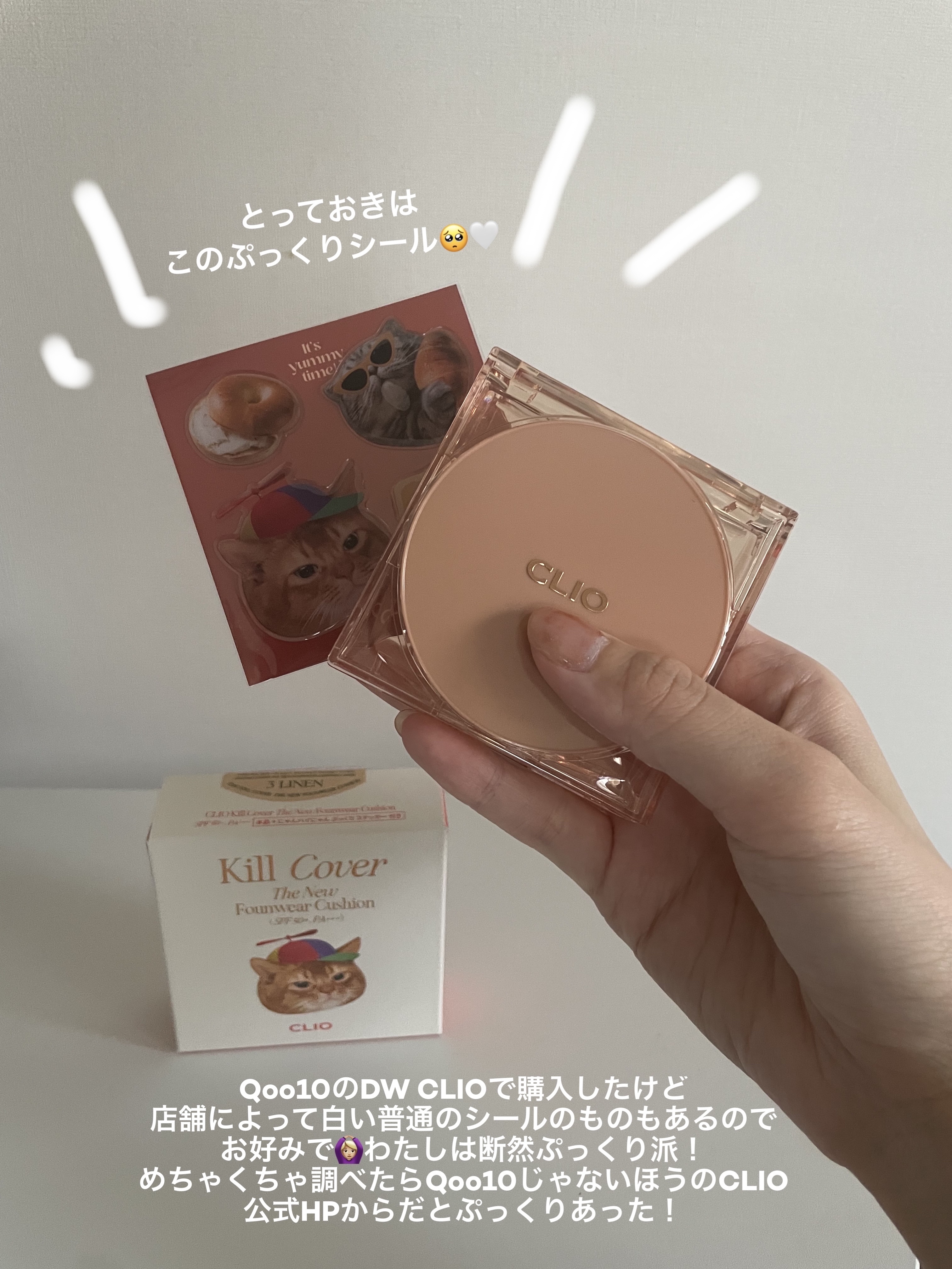 【猫様×高カバー×ナチュラル×崩れにくい】進化したキルカバーCLIOキルカバーザニューファンウェアクッション03LINEN(リフィルつき)スタイルコリアンにて2,590円で購入Qoo10メガ割で、2,890円→2,312円(作成時当時)で販売されています!【使用感】キルカバーって、カバー力めっちゃ高いけど、厚みがあって、厚塗り感があるというか、ファンデ塗ってます感があって、デイリー使いというより、たまに使うような感じだったのですが!!!今回のものは、みずみずしく、うすーく乗るけど、カバー力も◎しかも、パケ自体も薄くなった!カバーしたいところにはしっかりと乗せる必要がありますが、少量でも肌が綺麗に見えます。キルカバーザニューファンウェアクッションは、普通肌〜混合肌向けだそう質感はセミマットで、つるふわとした肌に崩れもそんなに気にならなかった崩れても少し毛穴が浮く感じで、パフで馴染ませれば、気にならない感じマスクにはほんの少しうつる程度!【色味の選び方】基本白めなので、普通ぐらいかなって思う方は、04ジンジャーを選べば、大丈夫だと思います。ただ、少し白めに仕上げたい方は、02か、03で、ピンク系のお肌、ブルベ寄り、華やかに仕上げたい方は、02イエロー系のお肌、イエベ寄り、くすみを飛ばしたい方は、03がおすすめです猫様とコラボしていないものは、もう少し色味選べるので、ぜひ、公式ページを見てみて下さい!ただ、猫様とコラボしているものは、とにかく可愛いんです!!!!!!!シールも付いていて、デコレーションできるし、クッション部分は足跡があって、パフの形も肉球みたいで、とっても可愛くてテンション上がる🐱💕リフィルつきで、猫様の可愛いパケ、使用感も◎で、とにかくお得すぎるクッションです。キルカバー苦手、あんまり仕上がり好みじゃなかったなって思う方も、是非このリニューアルしたこちらを使ってみて欲しいです!ぜひ!!!!#CLIO#キルカバーザニューファンウェアクッション#クッションファンデ#ベースメイク#夏の鉄壁ベースメイク