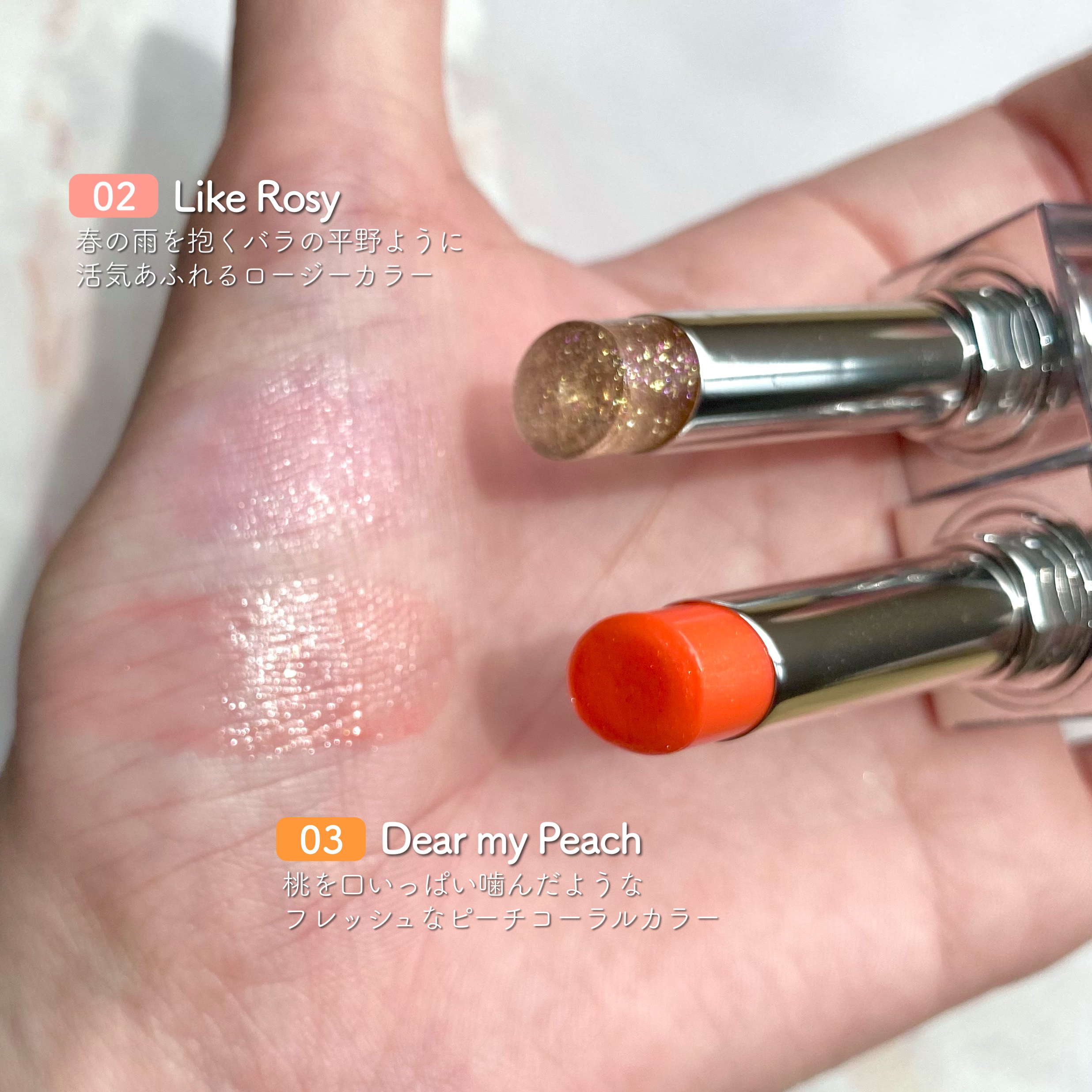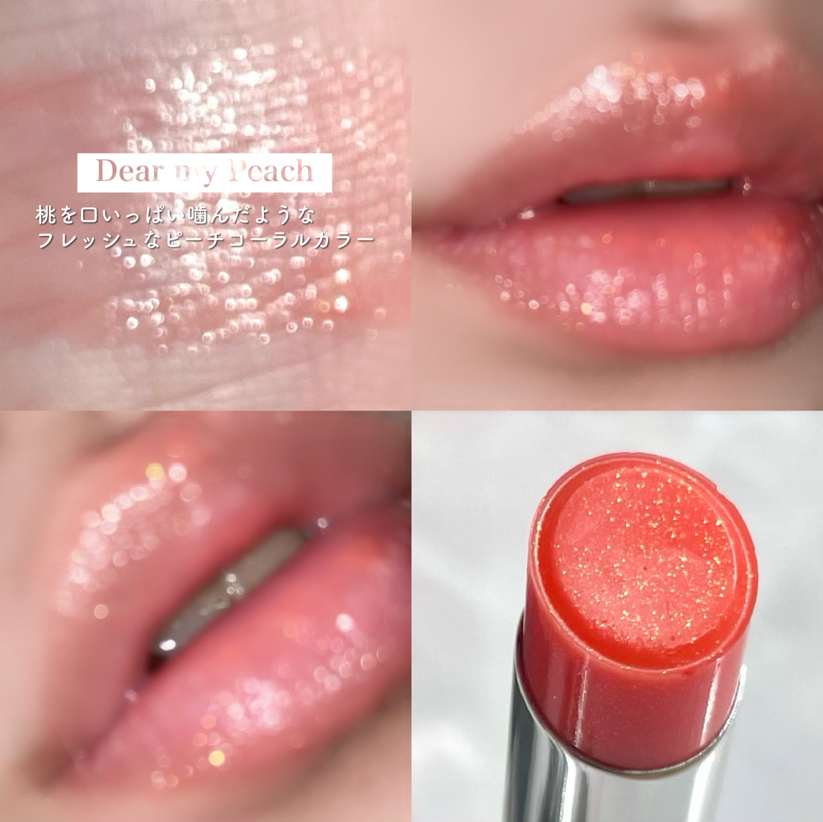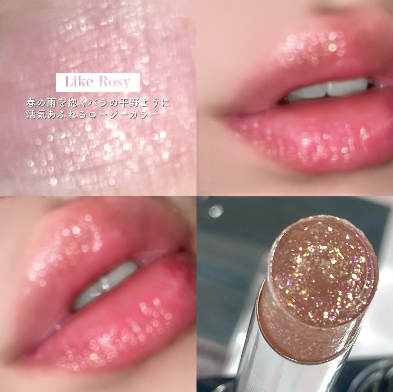 実際に使ってみて、キラキラと輝くラメが可愛くて、唇にほんのり輝きを足してくれるのが素敵✨しっとりとした付け心地です😊 実際に使ってみて、ゴールドやピンクのラメが可愛い♡唇をパッと華やかに演出してくれるのが良いなと思いました😍 実際に使ってみて、ほんのり色づき、さりげない自然な発色が素敵です✨コーラルメイクと相性良さそう...♡ 実際に使ってみて、自然な色づきで可愛い♡