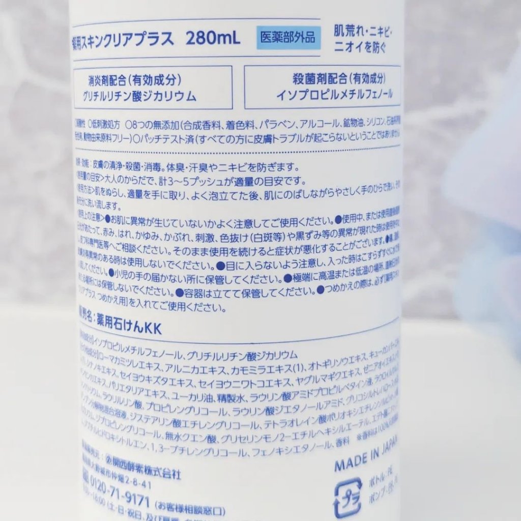 薬用スキンクリアプラス ボトル280ml2種類の有効成分*配合で大人の体臭や汗臭、デリケートゾーンの気になるニオイケアしてくれ、あせもなどの肌荒れやニキビを防ぎ、健やかな肌環境に導いてくれる薬用ボディソープサラッとめのテクスチャーで爽やかな香り!スッキリ洗えてる感じなのに洗い流した後しっとり感もあり乾燥肌でも心地よく使えました!泡タイプも良かったけど夏はゴシゴシ洗いたいので液体タイプがちょうどよかった🤭*イソプロピルメチルフェノール、グリチルリチン酸ジカリウム(有効成分) #PR#スキンクリアプラス#当選品レポ#関西酵素#ボディソープ#薬用ボディソープ#薬用スキンケアプラス#スキンクリアプラスで肌キレイ#ニオイケア