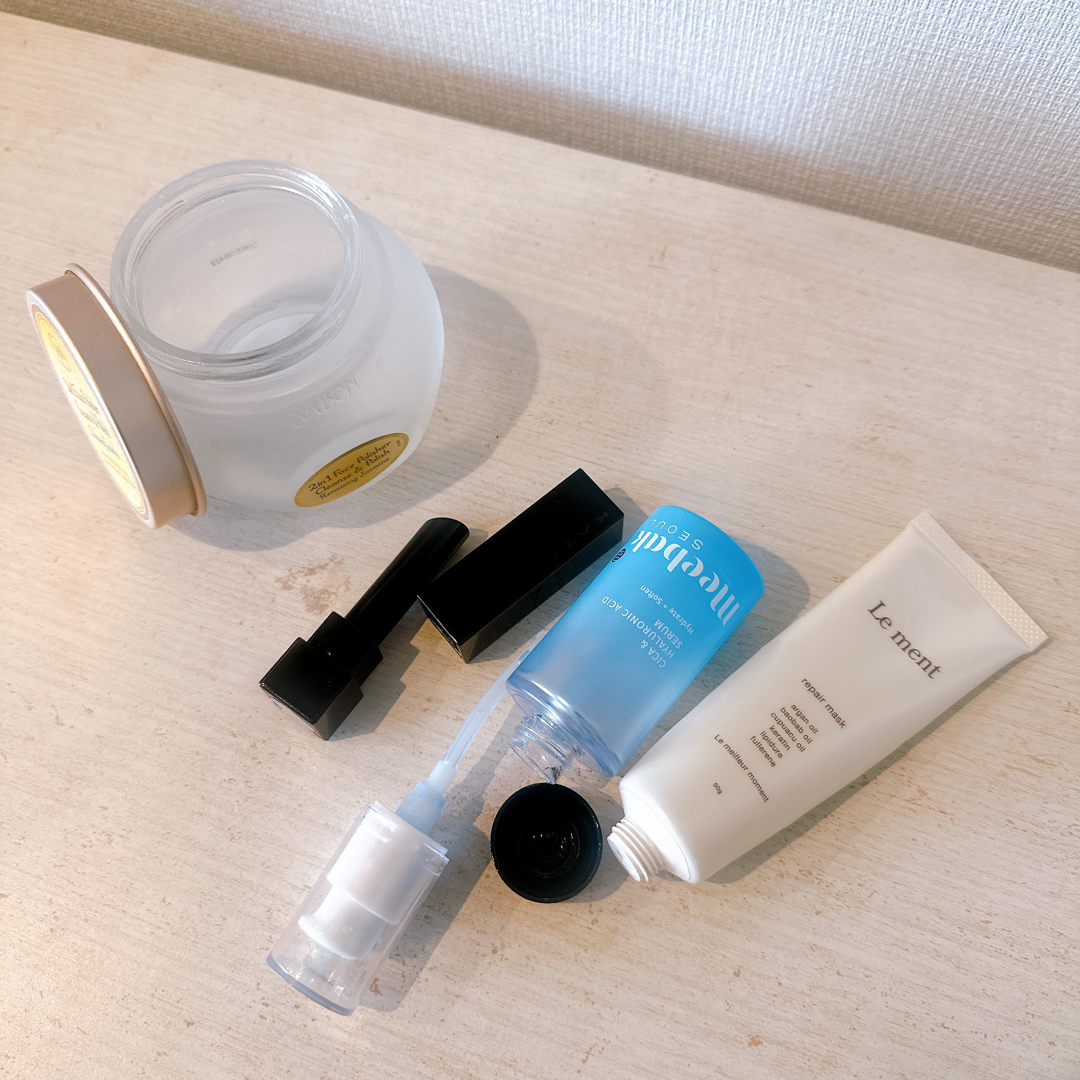 使い切りコスメ1月♡・SABONフェイスポリッシャーリファイニング・KATEケイトリップモンスター104桜色のひと時・MeebakCICA・HAセラム・Lementリペアマスクリップモンスターは沢山持ってるんだけど使い切ったのはこれが初めて!限定色だけどイエベ春の私にはめちゃくちゃ使いやすい色味だった♡#美髪#ヘアマスク#使い切りコスメ