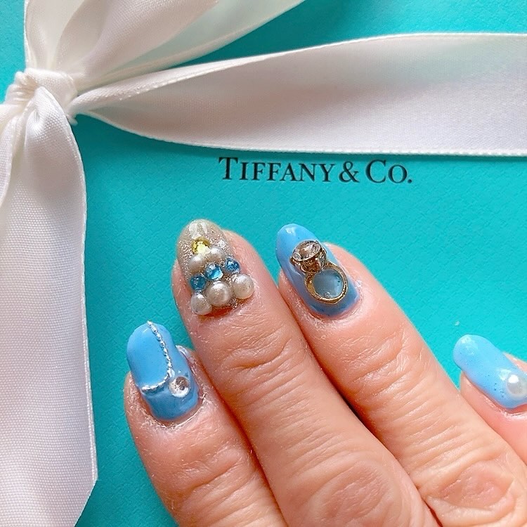 ティファニー風ネイル🩵ティファニー大好き💍ティファニー欲しいな🎁ティファニー誰かくれないかな🎄というメッセージを込めて🤭セリアのジェルネイル、ミルキーブルーを使ってみました🩵GelMeデコジェルとミラパとチェーンのパーツでオープンハートも作っ...