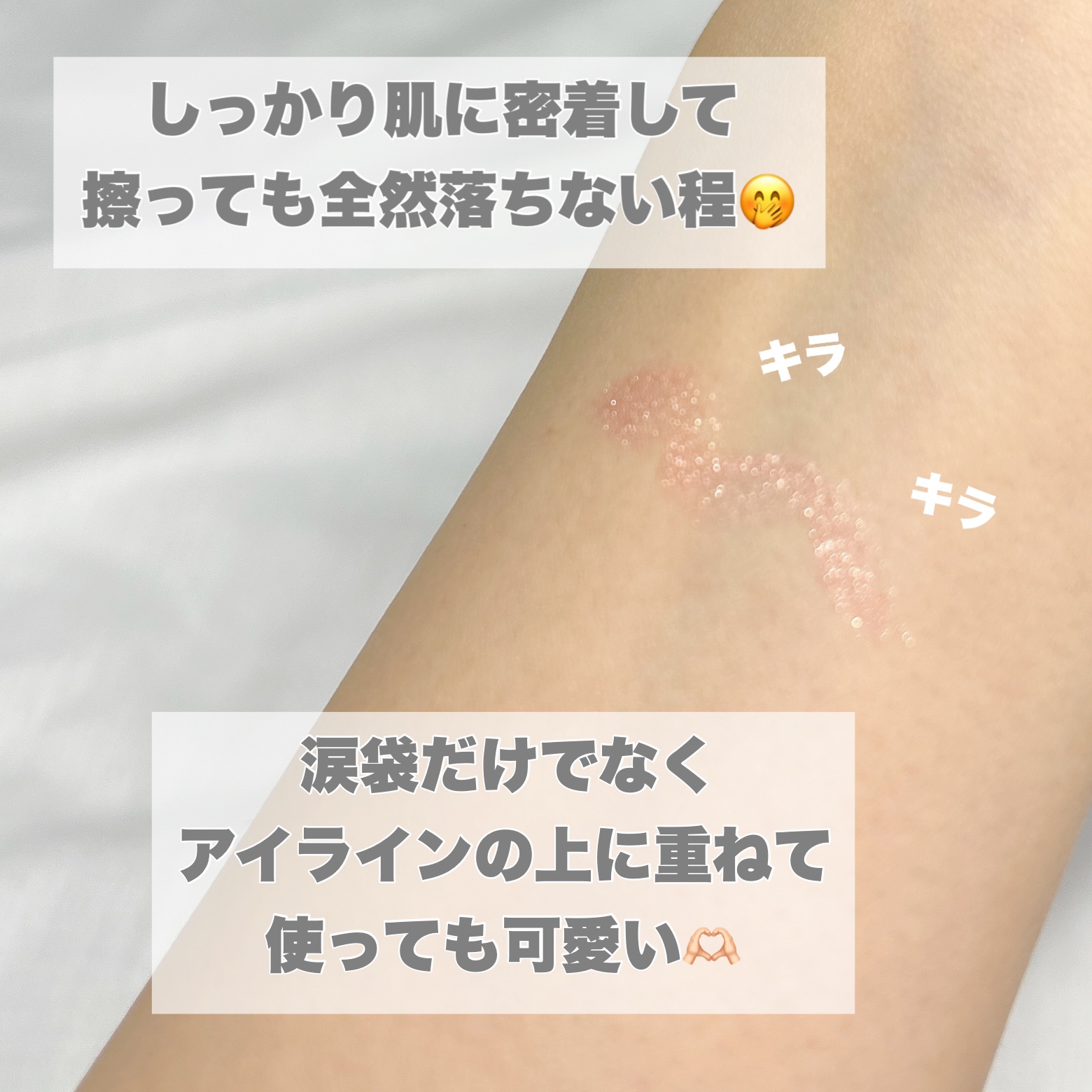 テクスチャーは水々しくてラインが引きやすい🪞 透け感のあるカラーなので往復して引いても濃くならないです💓 ナチュラルなキラキラ感でやりすぎ感のない涙袋が簡単に作れます✨👏