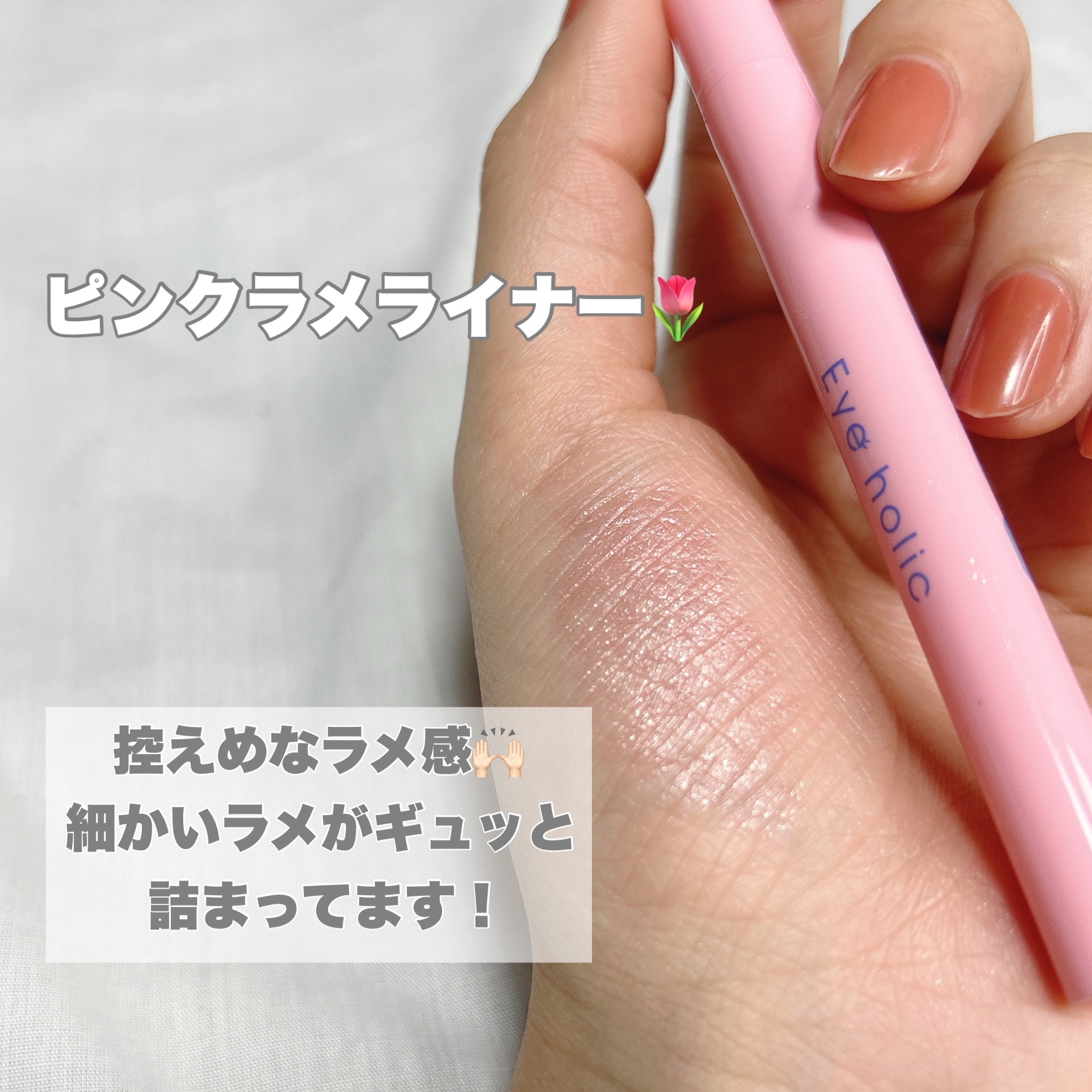こんばんはෆ꒡.̮꒡ෆ今回はアイホリックのラメライナーのレビューです!アイホリックラメライナー☆シャンパンピンク☆TikTokで見かけた可愛いラメライナーGET(*˙ω˙*)وグッ!正直、色持ちは期待してなかったからテスターで試してみたらめちゃくちゃ色持ち良すぎてビックリしました😳カラーどころかラメすらも全然落ちないです‼️これなら今の暑い時期も安心して使える✨️それに結構控えめなラメだから変に主張せず使いやすいです♪♪筆タイプなのでピンポイントに綺麗に塗れるのも良い👍🏻更にヒアルロン酸Na・パンテノール配合で目元ケアまで出来ちゃいます💕ピンクはちょっとな〜🤔って方にはシャンパンベージュがオススメ☝️買って損はない商品なのでぜひ使ってみてほしいです!ではでは、おやすみなさい_(:⁍」)_#アイホリック#ラメライナー#シャンパンピンク#生涯推しアイテム