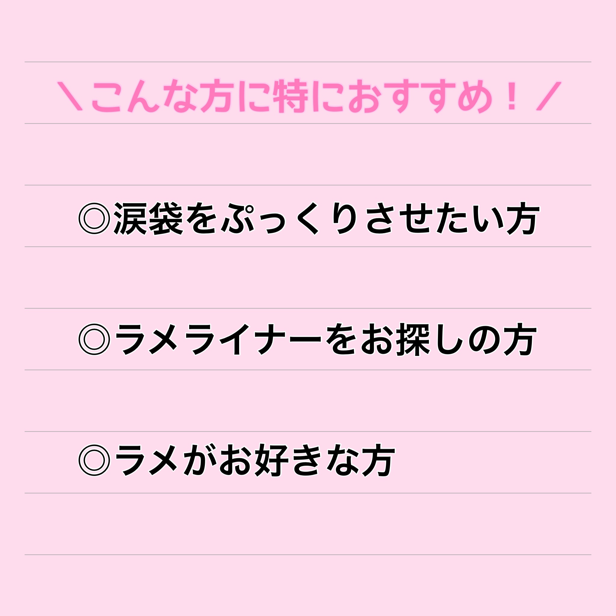 めっちゃ可愛いラメライナー✨ うるうる瞳涙袋ラメライナー 透け感繊細ラメでぴえん涙袋 うるうる涙袋が簡単に作れる涙袋爆誕ラメライナー 均一に発色する透け感リキッドラメライナー なめらかな描きごこちのラメライナーで 潤んだような涙袋を作ります 速乾発色キープ 肌にぴたっと密着することで発色をキープ 目元をケアする保湿成分配合