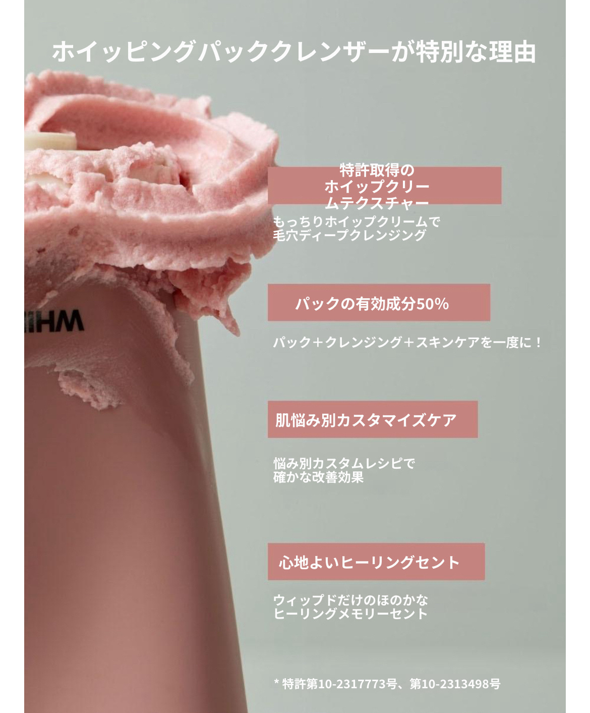 もう、見た目からして可愛いくないですか? まさにお菓子のホイップクリーム! 手に取った時の感触もホイップクリーム。 このピンクのホイップは、くすみが気になる敏感・乾燥肌用の「タルバ」というもので、香りはいちご+バニラビーンズ+ベルガモットの香り。 洗顔中は、いちごショートケーキを顔に塗っているんじゃないかというくらい、お菓子な感覚に包まていて、最高に幸せでした❤️ まさに万能なスキンケアでした。
