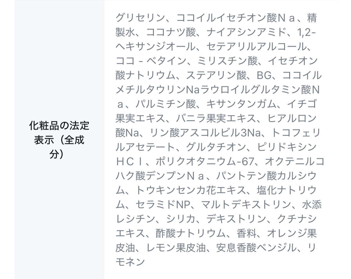 - グリセリン、ココイルイセチオン酸Na、精製水、ステアリン酸、ココベタイン、ナイアシンアミド、1,2-ヘキサンジオール、いちごパウダー、塩化ナトリウム、レモン果皮油、ベルガモット果実油、ライム油、香料、オレンジ果皮油、グルコース、フルクトース、クチナシエキス、デキストリン、バニラ果実エキス、シトラール、シトロネロール、リモネン、リナロール、ゲラニオール、安息香酸ベンジル