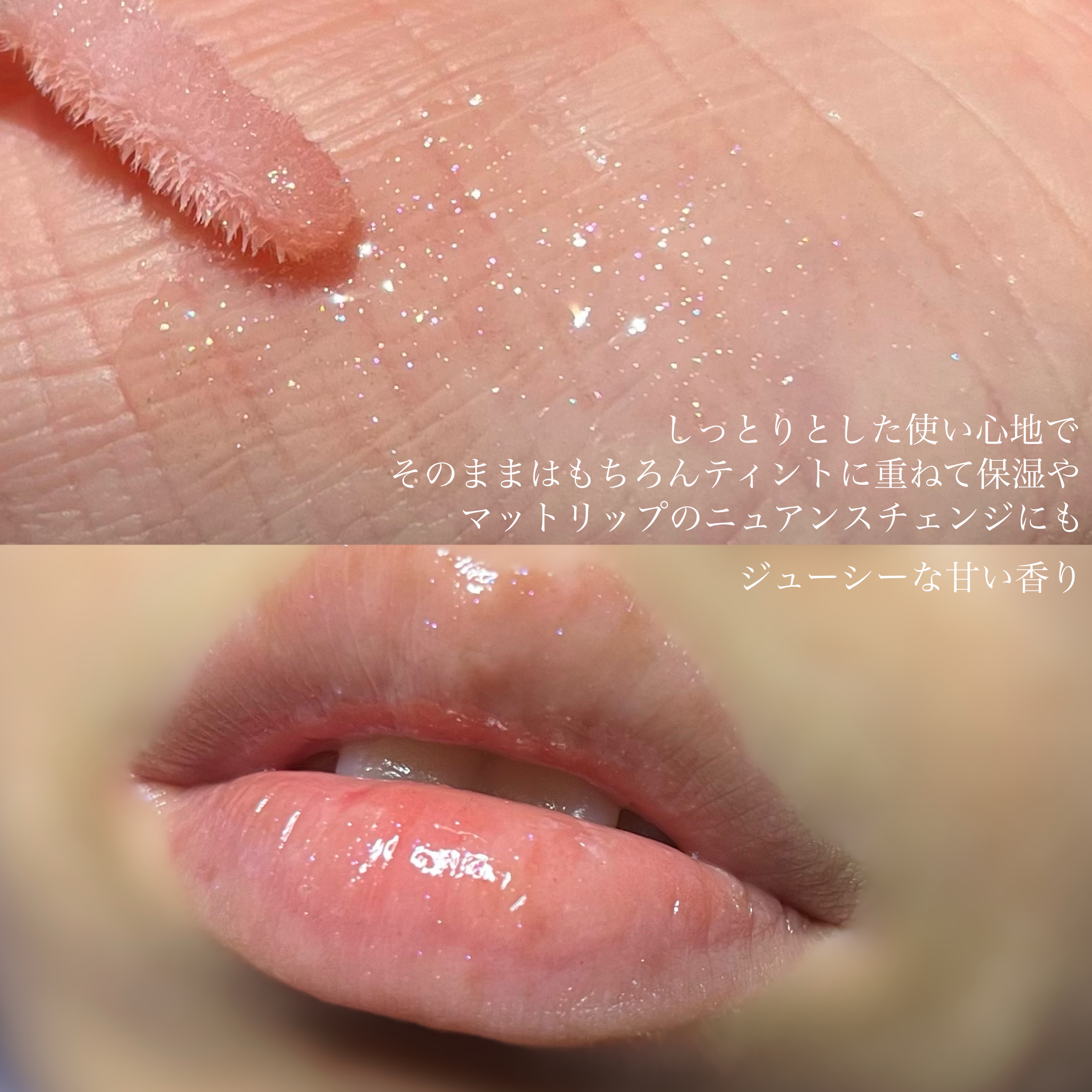 ほんのり血色感を足してくれる、春の月明かりのような温かみのあるコーラルピンクのクリアベース。 ちゅるんとしながら多色ラメがきらきらっとしてとっても可愛い。 透明なので、ティントの上に重ねて保湿したり、マットリップのニュアンスチェンジにも。