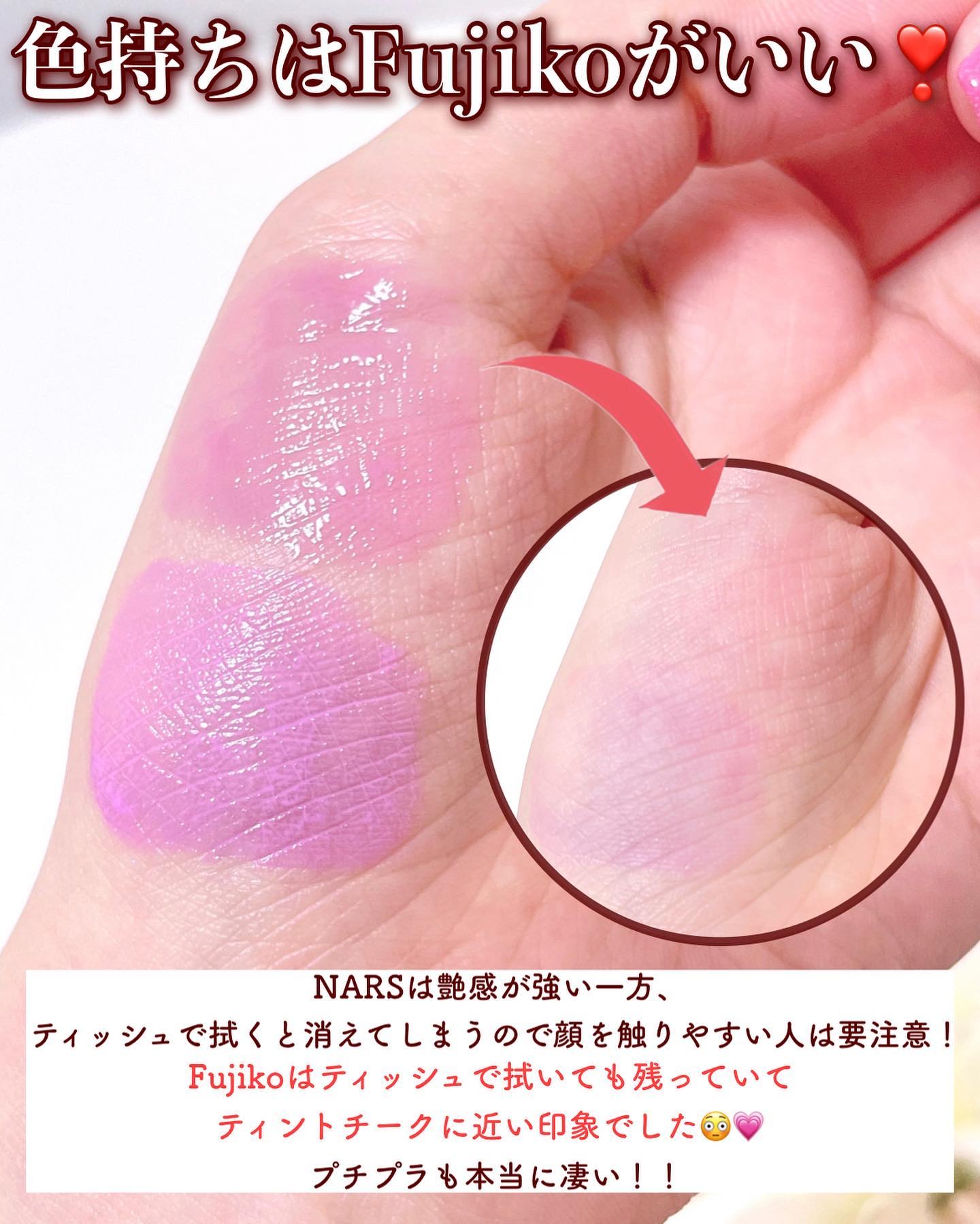 特にブルベ推しのラベンダーカラーが超人気なんです💗 フジコの水彩チークは白みを含んだ透明感を底上げするラベンダーカラー🥹 透明感と血色感が程よく出てラベンダーの中にピンク味を感じる印象✨ 青みを含んだ落ち着きのあるくすみラベンダーカラー💗 NARSはとにかくみずみずしくて水彩絵の具のようにジュワッと色付いていく❣️ 青みがしっかり出て、艶の立体感が感じられる💕 個人的にいい意味で仕上がりや色味に差が出たのでどっちもシーンで分けて使いたい!って思ったよ✨