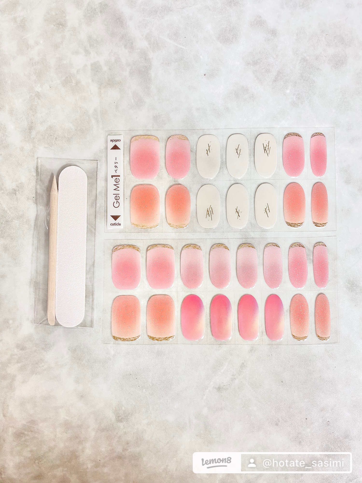 実はこれ…ジェルなのにシールだし、簡単だし、約2週間ももつんです…┈┈┈┈┈┈┈┈┈┈┈┈#ジェルミーワン#ジェルミーペタリーL2ピーチフィズ全33種¥1,870~1,980※ほたて調べ┈┈┈┈┈┈┈┈┈┈┈┈▼特徴▼硬化タイプのジェルネイルシール貼ってライトを当てるだけで簡単にサロンクオリティのセルフジェルネイルができちゃうカチッと高密着で約2週間もちます▼使用感感想▼ネイルサロンに行くとデザインにもよるけど3000~10000円くらいかかりますしすごくコスパ良いなと思いました!解説も分かりやすいし動画もあるので不器用な私でも簡単に綺麗に仕上がります遠くから見たらシールに見えないと思います私は手持ちのノンワイプトップコートを仕上げに使ってますが2週間くらいは余裕でもちました利き手の人差し指、親指あたりは1週間とかで欠けたり取れてしまいやすいですがたくさん入っていますし貼り直しも簡単でしたジェルミーワンの製品大好きだしこれすごく便利で可愛かったので他のデザインも欲しくなりました*°**********************いつも♥📎💬フォローありがとうございます♡質問などもお気軽に🦢Twitter、Instagram、LIPSなど同じアカウントでやってます♡@hotate_sasimi**********************#Gifting#今日のネイル#セルフネイル#気分UPコスメ