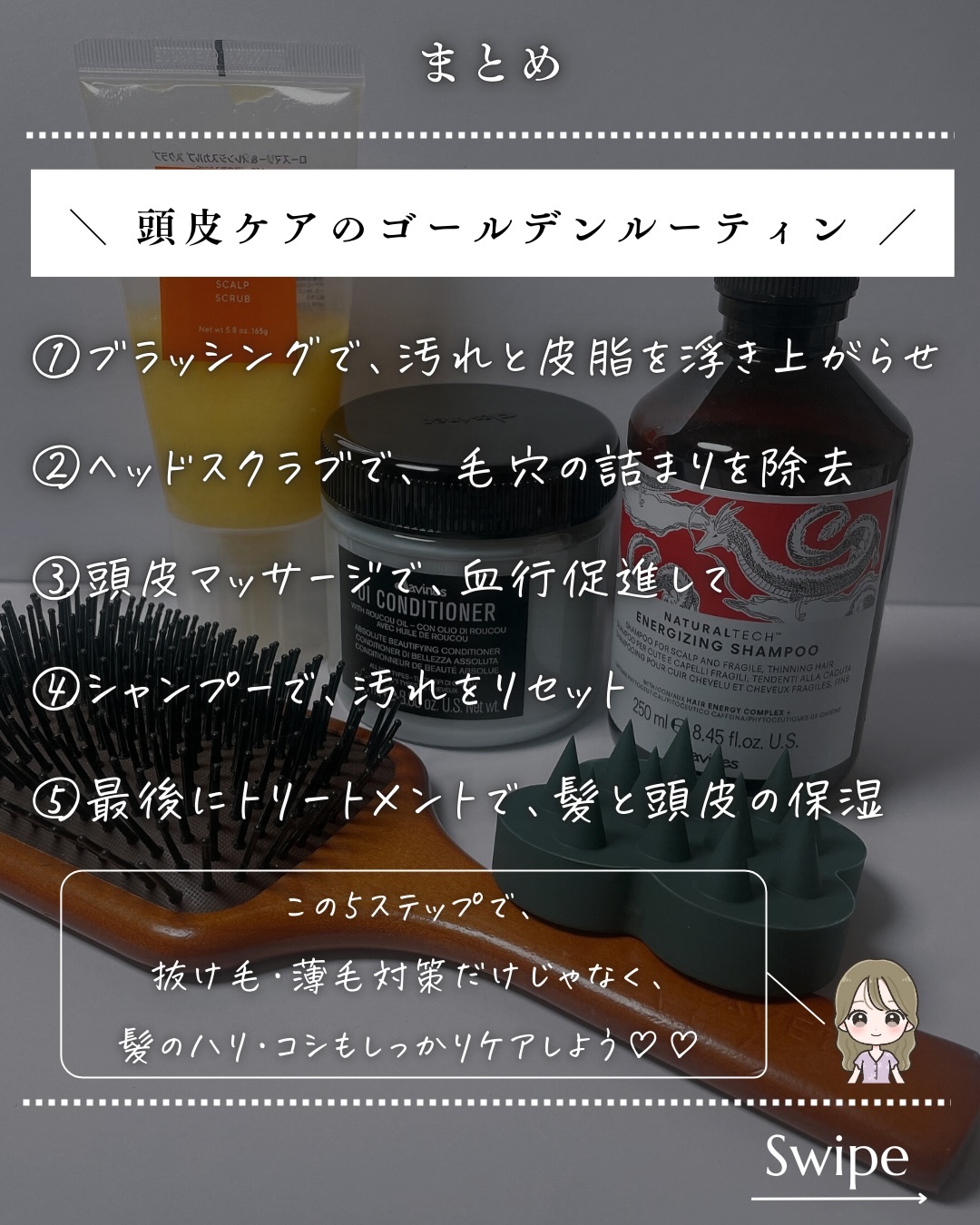 こんにちは!chinaです。@china.cosme▲過去の投稿も見てね♡今一押しのコスメを紹介します!保存して欲しいコスメを見逃さないでね🫡35歳過ぎてからシャンプーのたびに抜け毛が増えて、 「あれ…髪、細くなってきた?」と不安になる瞬間が増えて…🥲 床にも、洗面台にも、ドライヤー後の服にも髪が落ちていて、正直ショック。でも調べてみると、原因の大半は 頭皮の汚れ・詰まり・血行不良。つまり、毎日のケアにちょっと工程を足すだけで、髪は根元から変わる可能性が高いんです。悩みに悩んだ私が、実際に取り入れて効果を感じた ブラッシング→スクラブ→シャンプー→頭皮マッサージ→トリートメント の頭皮レスキュールーティンを紹介します💛 どれも1分以内でできる簡単ケアだから試してみてください✨ステップ①:ブラッシングおすすめアイテム:AVEDAパドルブラシシャンプー前にブラシ頭皮の地ならし🫧 これが驚くほど大事で、頭皮の汚れや皮脂が浮いて シャンプーの泡立ち・洗浄力がグッと変わるんです。使い方:毛先をやさしくとかして絡まりを無くして→根元からゆっくりと 効果:古い皮脂・ホコリを浮かせる/血行促進 →毛穴の通りを良くして、抜け毛対策のスタートラインに✨AVEDAのパドルブラシは、頭皮にポンポンあてると 心地よい刺激で本当に気持ちいい!これは毎日やりたくなる♡ステップ②:ヘッドスクラブおすすめアイテム:AROMATICAローズマリー&オレンジスカルプスクラブ週1〜2回のスペシャルケア 古い角質、皮脂、毛穴詰まりをごっそりオフ。 使い方:ぬるま湯で軽くすすぐ→頭皮にスクラブをON→指の腹でくるくるマッサージ→シャワーで流すだけ。これだけで頭皮がすっきり軽くなって、 トップにふわっと空気が入ったみたいな感覚♡ステップ③:頭皮マッサージおすすめアイテム:ukaスカルプブラシケンザンバリカタケンザンは頭皮のコリが一瞬でほぐれて、 血行アップの即効性がすごい…🥺❤️❤️使い方:頭皮に軽く押し当て→下から上へ引き上げるようにマッサージ。 PC疲れ・肩こり・目の重さにも効いてくれる優秀アイテム。youtubeで詳しい使い方動画が載っているから見てみて~!頭皮が柔らかくなると、髪に栄養が運ばれやすくなって抜け毛対策にも直結◎ステップ④:シャンプーおすすめアイテム:Davinesナチュラルテックシャンプー<E>スクラブで毛穴を開いたら、次はシャンプーでしっかりリセット。 ナチュラルテック<E>は、 皮脂バランスが乱れやすいアラフォー頭皮にちょうどいい。ベタつき・におい・皮脂の乱れをケア💛 ハリ・コシを守りながら根元がふんわり 軽い仕上がりで、トップがぺたんとしにくい、髪が細くなった気がする…という人こそ使ってほしいシャンプー。ステップ⑤:トリートメントおすすめアイテム:Davinesオイコンディショナー最後は髪にしっかり栄養と潤いをチャージ。 オイコンディショナーはしっとりツヤ髪になれるのに重くないのが魅力💓切れ毛・パサつきを補修 毛先までしなやか&指通りUP ハーブ×バニラの癒しの香りでバスタイムまで満足髪が綺麗だと、それだけで若見えするから嬉しいよね♡この5工程を意識するだけで、 抜け毛、ハリコシ、トップのボリューム感が私は変わった😍❤️❤️抜け毛に悩むアラフォーのみんなへ。今日から一緒に 頭皮のゴールデンルーティン試してみてね♡================================\仕事に子育てに恋愛に、毎日忙しい30代へ/▽すきま時間にキレイを手に入れよう💄✨▽アラサーOLが本音でレビュー🧴▽愛用品、まとめはハイライト&リンク👀気になる方は、プロフィールへ!「#時短美容#ながらスキンケア」タグもおすすめ🫡================================#ネイルシール#頭皮ケア#美髪#髪質改善#美容#cosmekitchen#スキンケア#うるふわ髪アプデ計画