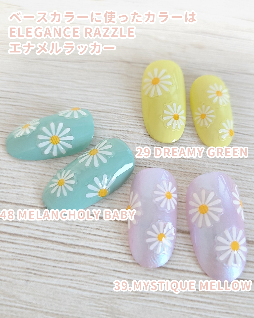 【マーガレット柄ネイル】ダイソーネイルステッカーを使ってマーガレット柄ネイルをしました。パステルカラーや明るいカラーによく合います。水転写式と比べるとシール張ったのがわかるので仕上がりは水転写式のシールの方がやっぱり綺麗ですが台紙からはがして貼るだけなのはすごく楽です。使用した商品はこちら✼••┈┈••✼••┈┈••✼••┈┈••✼••┈┈••✼<ベースカラー>ALBIONアルビンエレガンスラズルエナメルラッカー定価1,320円(税込)29Dreamygreen パステルイエロー48Melancholybaby パステルグリーン39.Mystiquemellow パープル系パールカラー<シール>DAISOネイル ステッカーシール マーガレット 110円(税込)<ネイルチップ>セリア オーバル✼••┈┈••✼••┈┈••✼••┈┈••✼••┈┈••✼