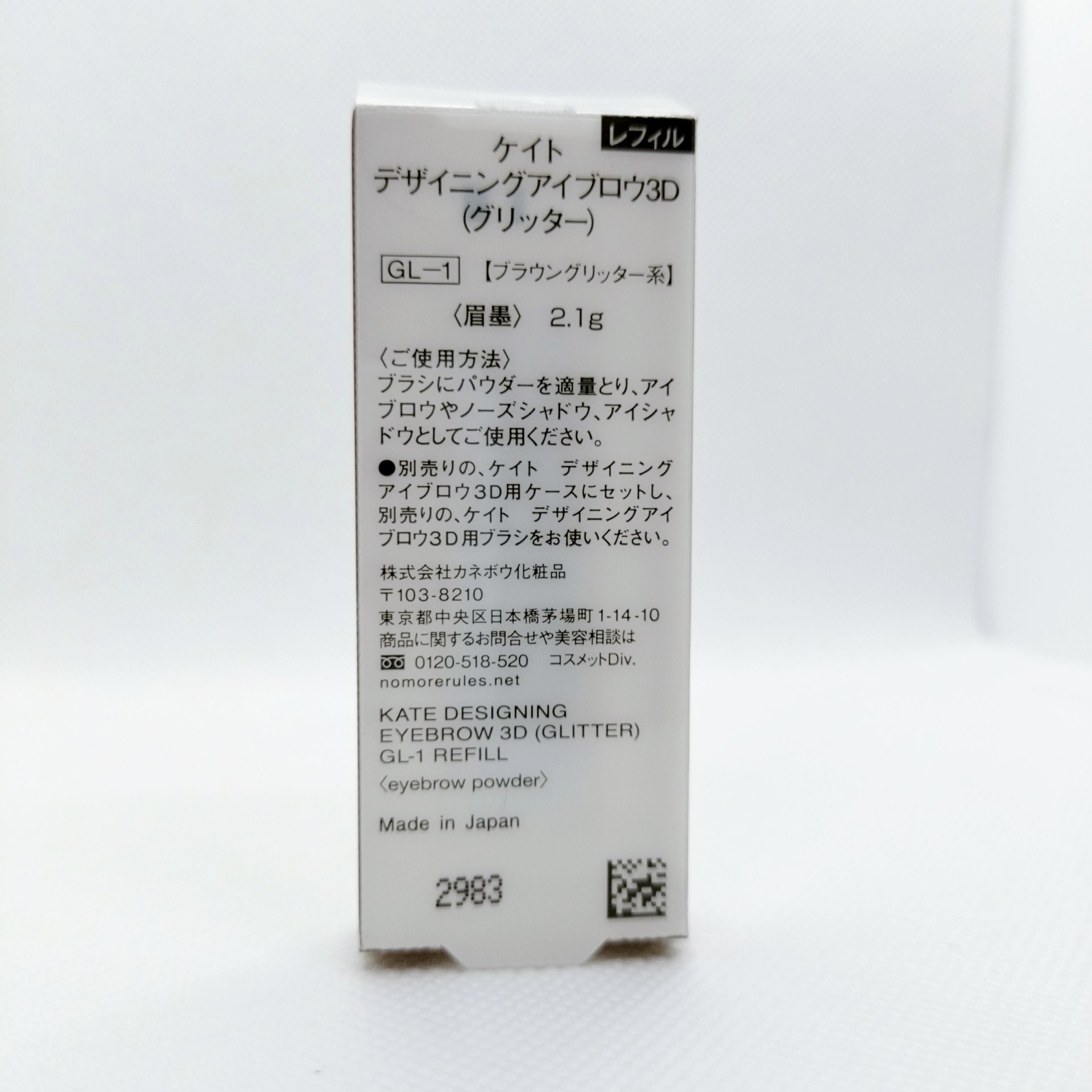 KATE♢レフィル880円ケース220円ブラシⅠ220円〇デザイニングアイブロウ3D GL-1ブラウンクリッター系2.1g・ふんわり自然な立体グラデ眉とノーズの陰影で、立体的な目元を演出する濃中淡3色入りパウダーアイブロウ。・アイブロウ、ノーズシャドウ、アイシャドウや涙袋のメイクに使える1品4役。・レフィル全10種。*アイブロウパウダーでラメ入りは珍しいなと思い購入しました。パウダーなのでふんわりな眉毛をかくことができさりげないラメ感が可愛いです。アイシャドウとしても使えるので目元を統一できて良いなと思いました。コメント、質問お気軽にどうぞ。以上、クールでした。
