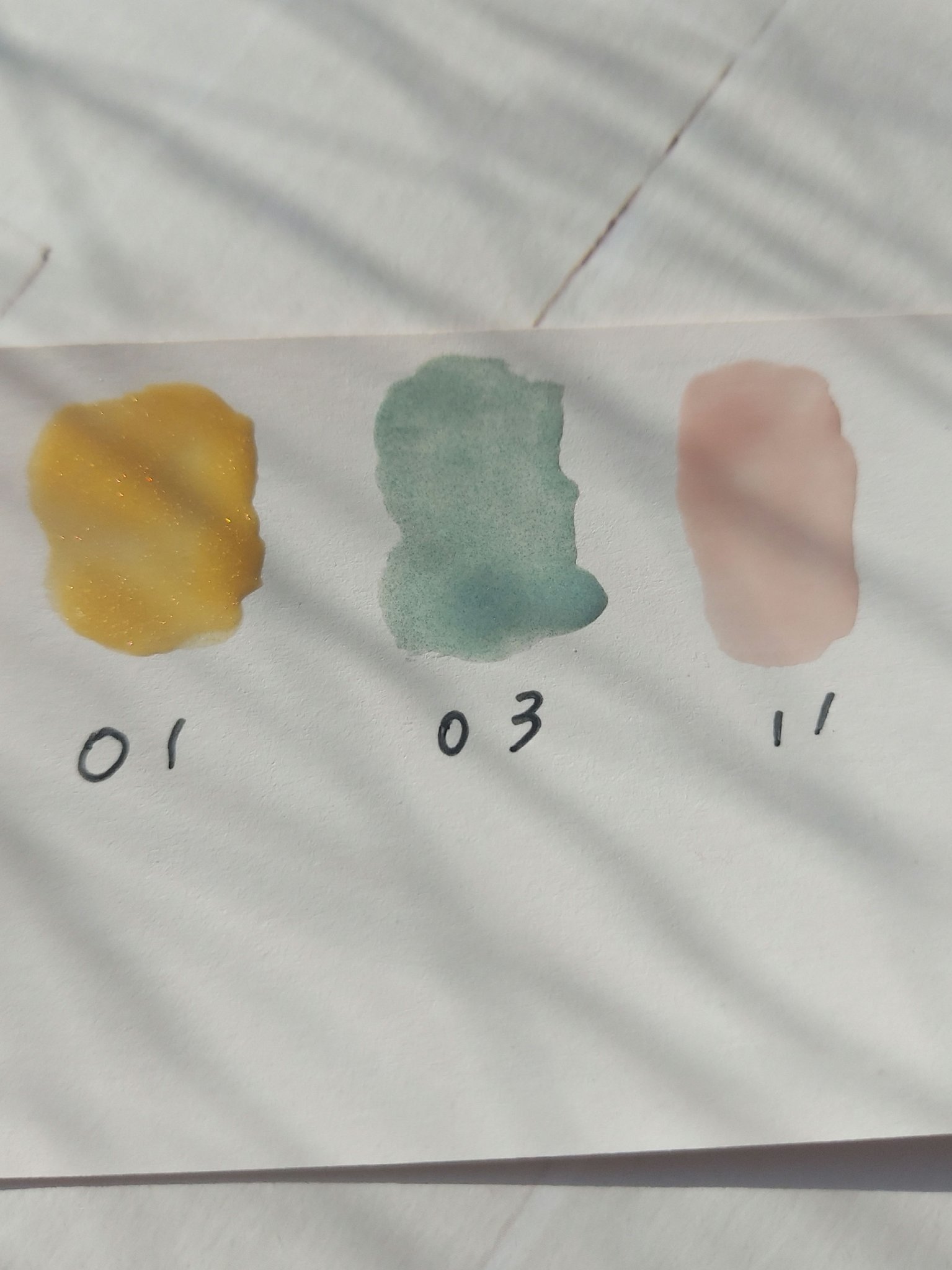むらにならない、塗りやすい、発色が良い, 11は仕事に使うのにいい色味です。 01のイエローには、ピンクパール, 03のグリーンには、グリーンパール入り。 かわいい。おすすめです。