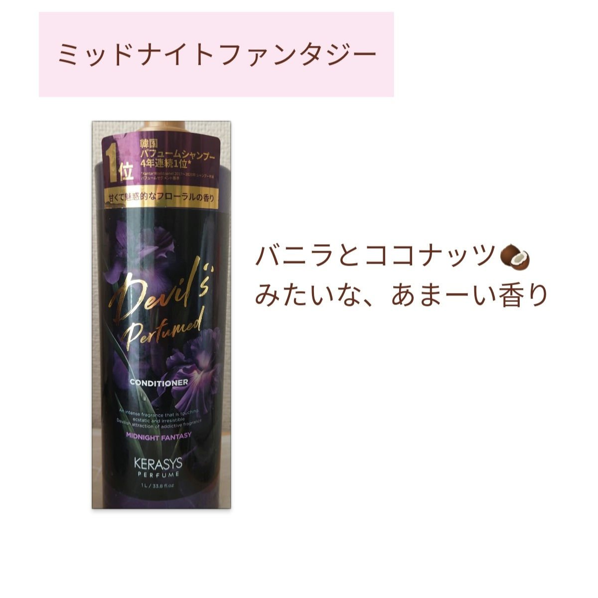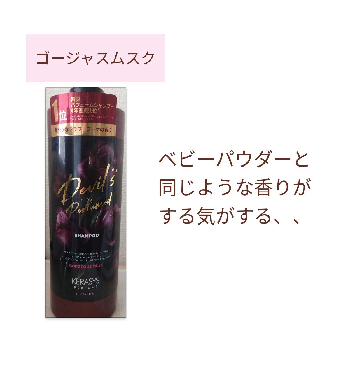 初めての韓国シャンプー、ケラシス自体は私の髪の毛に合ってるみたいで、リピートはいつかなくなったらするだろうという感じ✮どの香りも気になって何種類かその後に購入した香りの感想です#KERASYS#パフュームラブリーデイジー⬇お花かわからない😳やな匂いでもいい匂いでもないという香りあんまり残らない#デビルズパフューム#ミッドナイトファンタジー⬇強くてあっまい、おっもい😳🍂個人的に、秋冬向けの香り❄#ゴージャスムスク⬇魅惑的感がわからない😳ベビーパウダーをほんのりさせたような香りデビルズパフュームがこの中だったら一番すきだけどミッドナイトファンタジーのシャントリにするとおもーい香りすぎるので今はゴージャスムスクのシャンプーデビルズパフュームのコンディショナーにしています✮