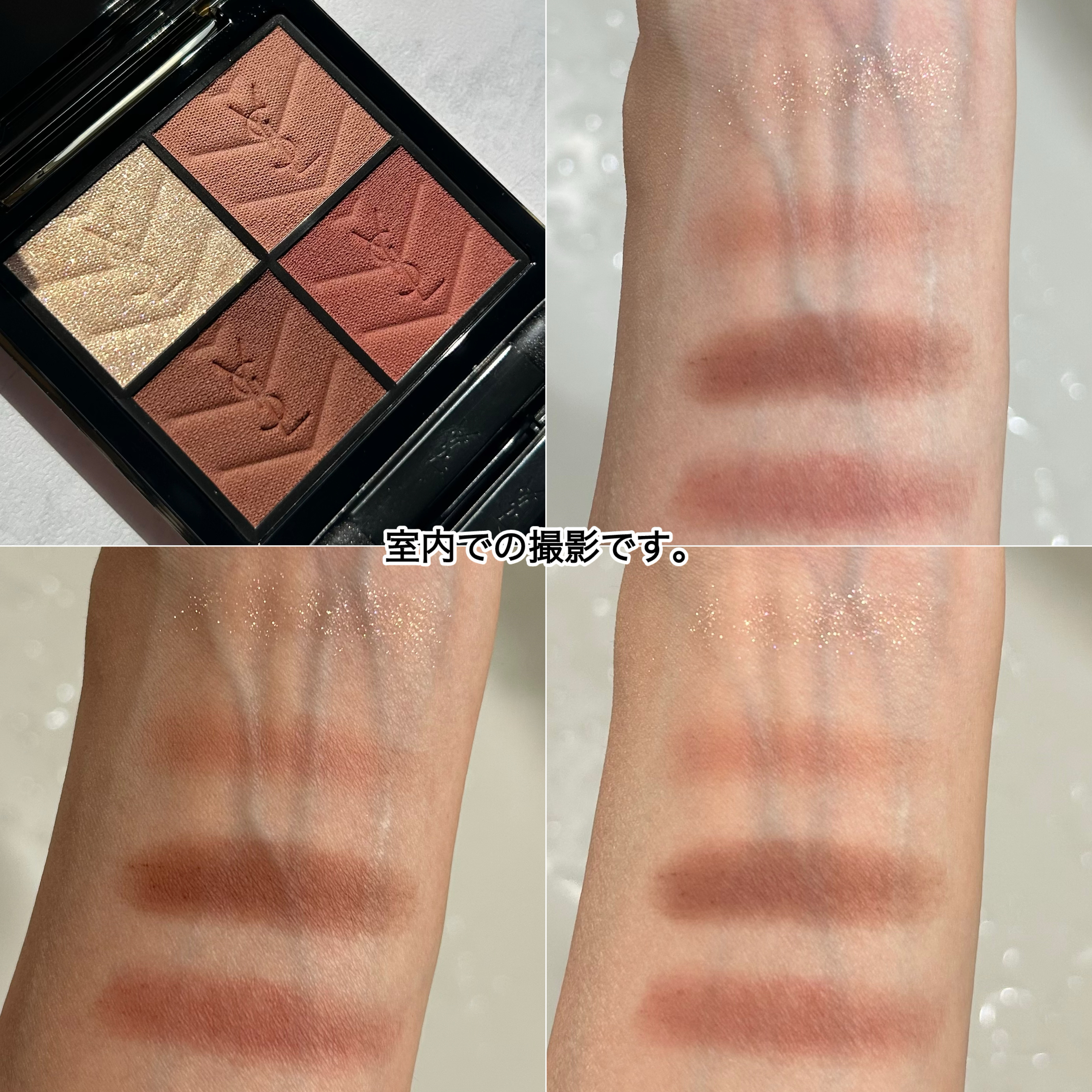 ヴィンテージ感のあるくすみテラコッタカラーが目元に美しい立体感とスタイルを。 左上のイエローゴールドとピンクのパールが散りばめられたカラーがひと塗りで印象を変えアレンジの幅を広げる。 YSL新作パレット2種類目✨ 正直普通の赤みパレットと思ってた スウォッチ撮ってもうんうん。思った通りだな〜と‥ メイクしたらさ、めっちゃ可愛いの笑 こっくり濃いめ、でもマットが粉っぽく見えないし ラメがキラッキラよ