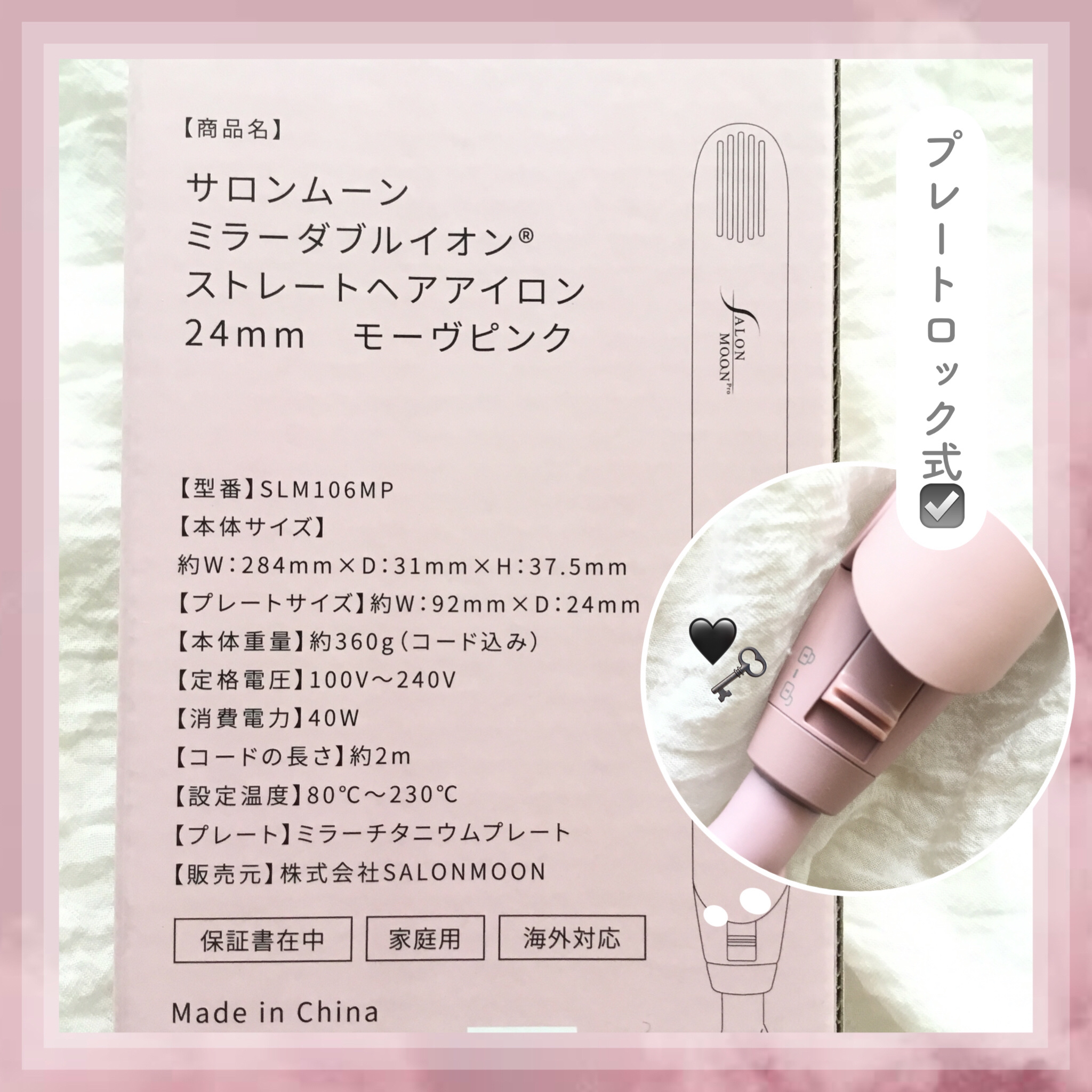SALONMOONミラーダブルイオンストレートヘアアイロン24mmモーヴピンクを購入しました!メガ割で定価8600円の所、3500円程で購入しました!半額以下!! 使いやすすぎる笑 今までサロニアさんの2way使ってたんですが、3年ほどつかい、プレートの塗装がはげてきてしまったので買い換えました! 滑りがよい!!すぐにストレートになります!温まりも早いです!!!
