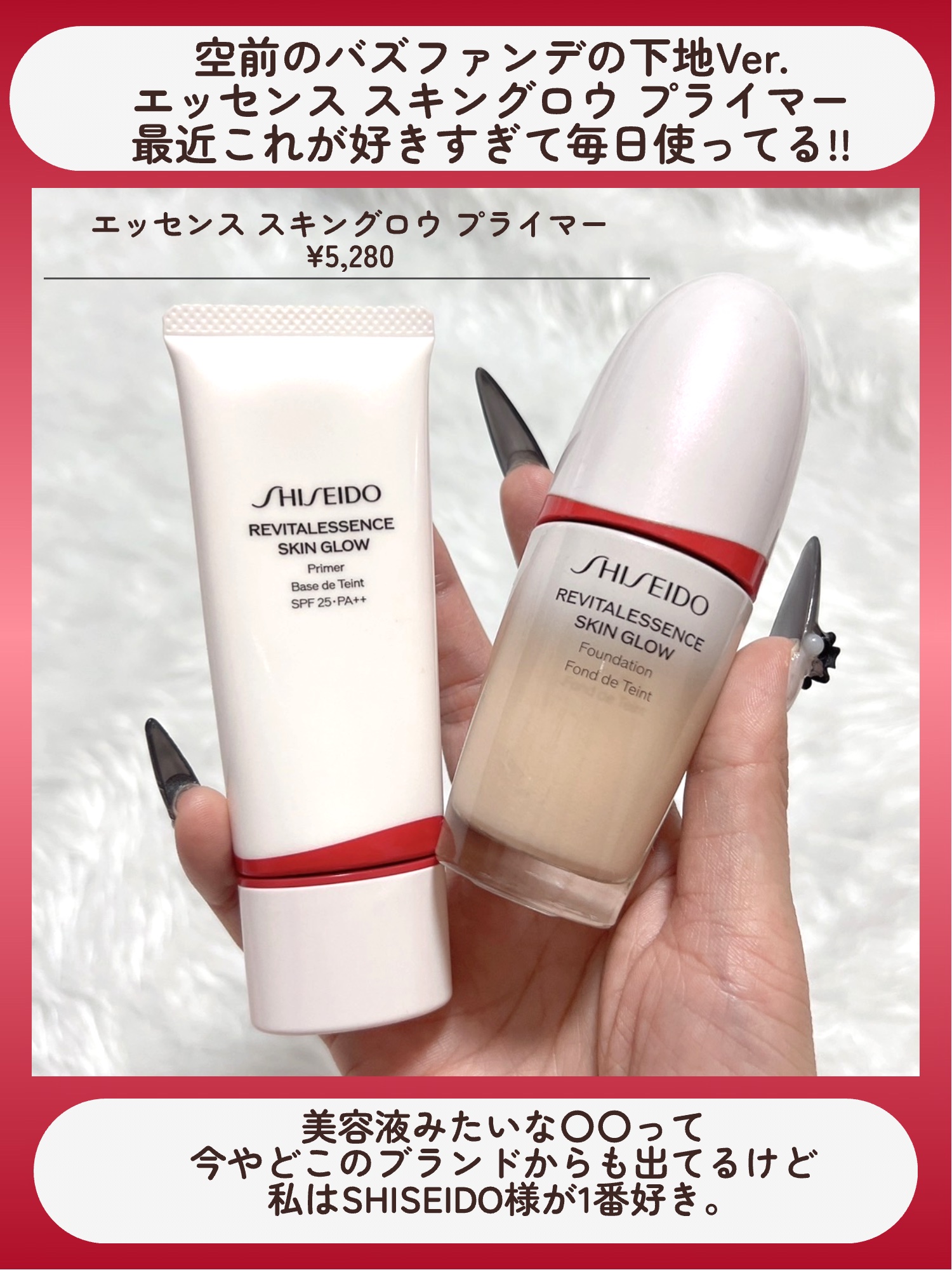 冬の推し下地❄️乾燥が気になるツヤ肌好きさんは是非チェックして💓//空前のバズをぶちかましたSHISEIDOのエッセンススキングロウファンデーションそのシリーズのプライマー!!あのツヤファンデと同じ美容成分が入ってるんだって!!美容液みたいな〇〇とかスキンケアみたいな〇〇って今はどこのブランドでも多いけどやっぱり資生堂様が1番好きです😊❤️エッセンススキングロウプライマーは薄ピンクのみずみずしいテクスチャーなんだけど色で整えるというより光とツヤで肌のアラを整える感じ!!こっくりしてないのに保湿感もあるし薄膜だから上からファンデ重ねても厚みでないのが好き!!私はスキンケアのクリームのように全顔に結構使ってます✌️最近はクリオのピンクファンデと合わせてよく使ってるけどどのファンデと合わせても相性いいのも使いやすい!!SPFとPAが低めだから夏には向かないけど冬にはめちゃくちゃおすすめ💓下地難民はチェックしてみて✨#ご褒美コスメ会議#デパコス#ツヤ肌#ベスコス#コスメレビュー#下地おすすめ#ツヤ肌メイク#保湿下地