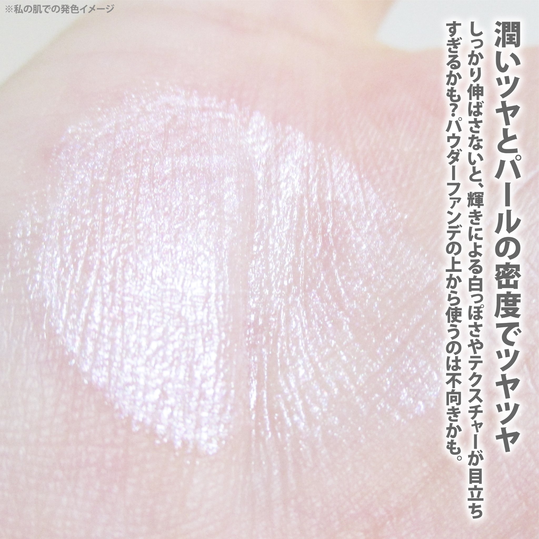 パーソナルカラー問わず使えるお色です* 落ち着いたパール感が上品で 透明感をプラスしてくれるのでめちゃくちゃ可愛い!♡♡ アルコール・パラベン・ミネラルオイル・合成着色料フリーで使いやすく、 マリンコラーゲンやアルガンオイルを配合しているので 時間が経っても乾燥せずに長時間綺麗なツヤが続きます✧︎ ピタッと密着して少量でツヤが出るのでコスパも良い◎ Cゾーンや鼻だけでなく、 目元や唇のポイントメイクにも使えるし、 耳たぶやデコルテに塗っても ツヤ感が華やかさをアップしてくれてめっちゃ使えます♡