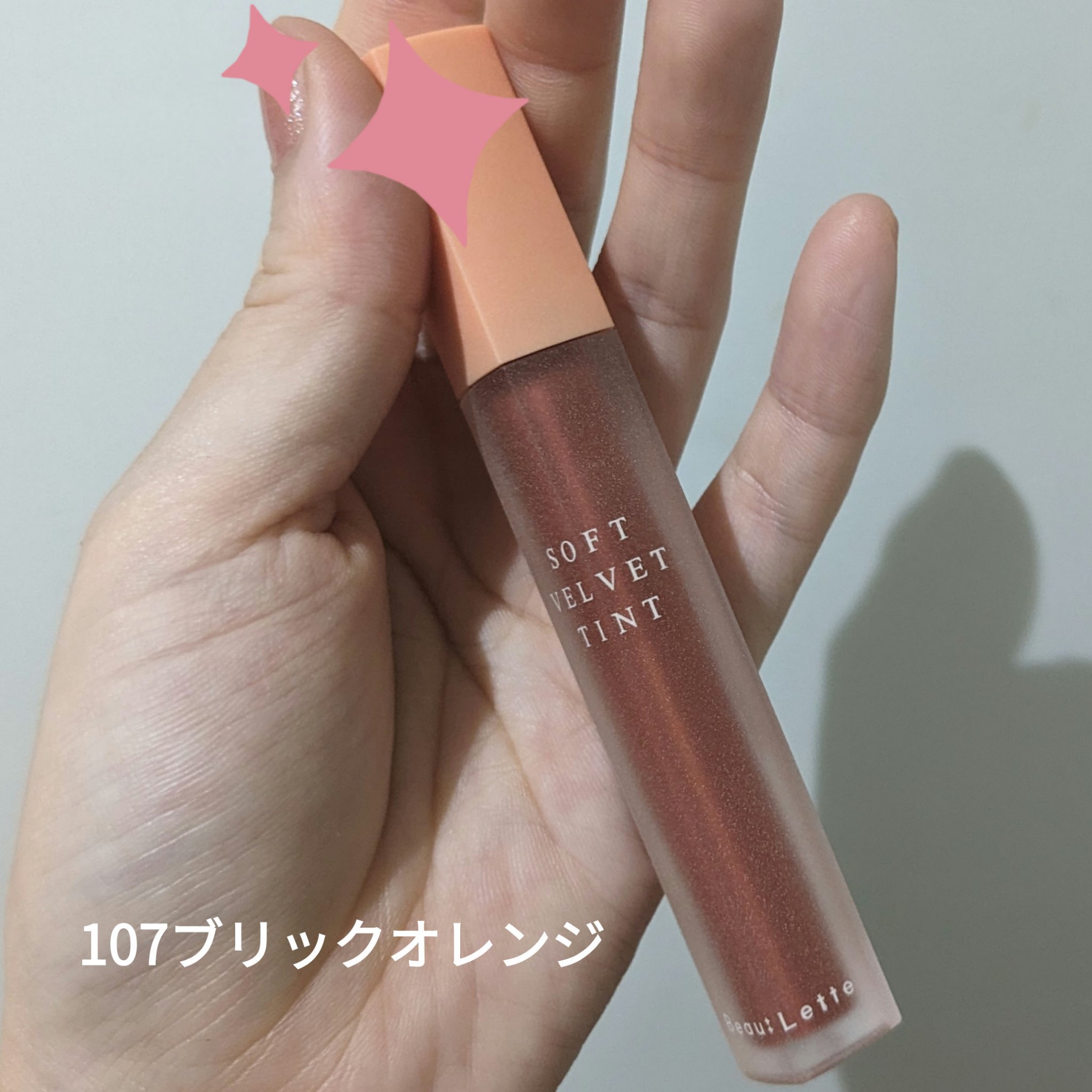 Beaulette(ビューレット)のソフトベルベットティントです☆102番コーラルキスと、104番ブリックオレンジ、買ってみました!唇の写真あります。ブラーフィルターをかけたようなヨレずにふんわりと広がるシルキーテクスチャーで、繊細に唇のシワ...