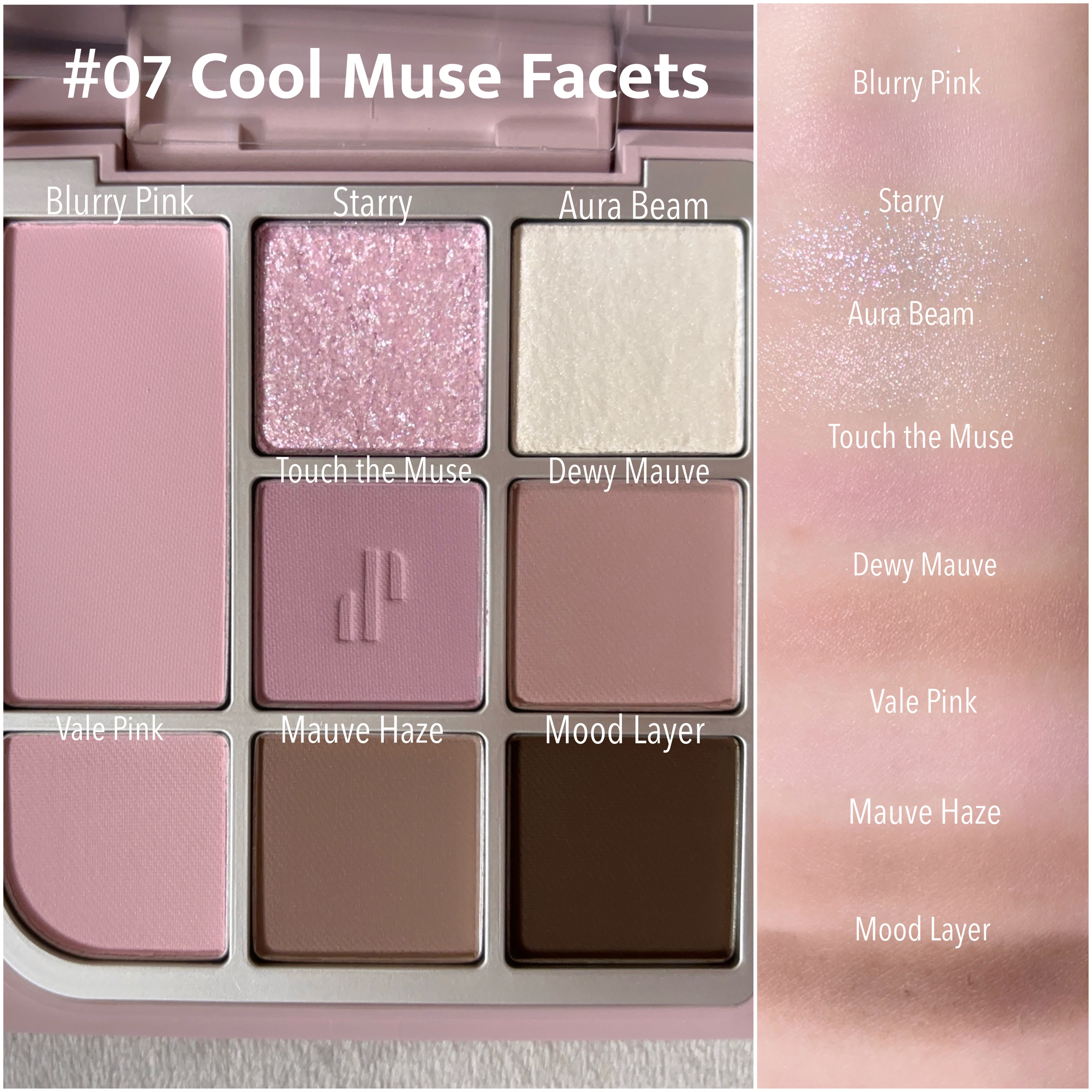 07 クールミューズファセット クールトーン向けの白みピンク系カラーが揃ったパレット。 上段の2色はラメやパール感がきらめくカラーなので華やかな印象にも仕上げることができます。 08 ニュートラルミューズファセット 青みにも黄みにも寄らない、グレイッシュなカラーが揃ったパレット。