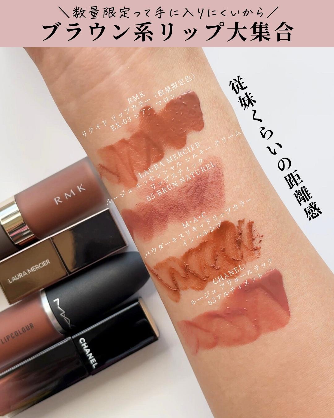 @mimimi_cosme◁他の投稿はこちら👈【甘めミルクチョコカラー🍫が今の気分】RMKリップの数量限定色が大人に刺さり過ぎた件。-------------------------♦︎商品詳細RMKリクイドリップカラー(数量限定色)EX-03シアーマロン4,180円(税込)♦︎販売情報店舗/公式オンラインストア各百貨店オンラインストアで購入可能※この前まであったのにどこも在庫無くなってる🫨RMKさん在庫復活希望です🙇♀️---------------------------リップはただでさえついつい買い足しがち。でもさ、最近はマスクを外す機会が増えたからいくら買ってもいいよね?(バグ)なコスメ狂いOLみみみです🙋🏻♀️今年の秋に買い足したいブラウンリップ発見したよ〜🍂RMKリクイドリップカラーの数量限定色が出てたんだけどその中でもEX-03シアーマロンがめちゃめちゃツボカラー✌️ブラウンリップってかっこいいんだけど、いつもの自分のテイストと合わなくて結局お蔵入りしちゃうことない?(私は非常に心当たりある🥹)タッチアップした時は、あーこれいいわ。良い女だわ笑ってなるんだけど、家でつけるとあれ?唇怖くね?ってなるんだよね。不思議〜🫨🫨このカラーは、手につけると一見今までと同じようなブラウンリップじゃんって思うんだけど、唇にのせるとあら不思議ちゃんと肌に馴染むのにこなれ感たっぷりな印象。これなら甘い系でもカッコいい系でも合わせられる👏主張し過ぎないからメイク全体のバランスも取りやすいよ☺️テクスチャーもさらさら伸びるしほんのりツヤがあるのもヘルシー感が出て◎ティント効果もあって今までのリップのいいとこ取りって感じだね🫶はい、最高〜!お気に入リップ確定〜!ただ、このカラー数量限定で入手できない可能性もあるから🥹おすすめのブラウン系リップも紹介するね🙋🏻♀️(ブルベさんにおすすめ)LAURAMERCIERルージュエッセンシャルシルキークリームリップスティック05BRUNNATUREL(イエベさんにおすすめ)M・A・Cパウダーキスリキッドリップカラーインパルシブ(ブルベさんにおすすめ)CHANELルージュアリュールラック63アルティメットブルベさんはローズ寄りのブラウンの方が似合うぞ!🌹イエベさんはチョコ系ブラウンが肌馴染みよき!🍫RMKリクイドリップカラーすごい使い心地よかったなあ他の色も気になる🤔🤔みんなの今年の秋推しリップ教えて〜🍂💄んじゃまたね〜👋👋👋みみみ-----------------------------------------@mimimi_cosmeではコスメ狂いOLが贈る失敗しないコスメレビューをしてるよ🙋🏻♀️コスメ選びのご参考にっ!よかったらプロフィール飛んでね💄-----------------------------------------#rmk#アールエムケー#リップ#新作コスメ#ブラウンリップ#cosme#デパコスリップ#とっておきのツヤを教えて#爆盛れリップ
