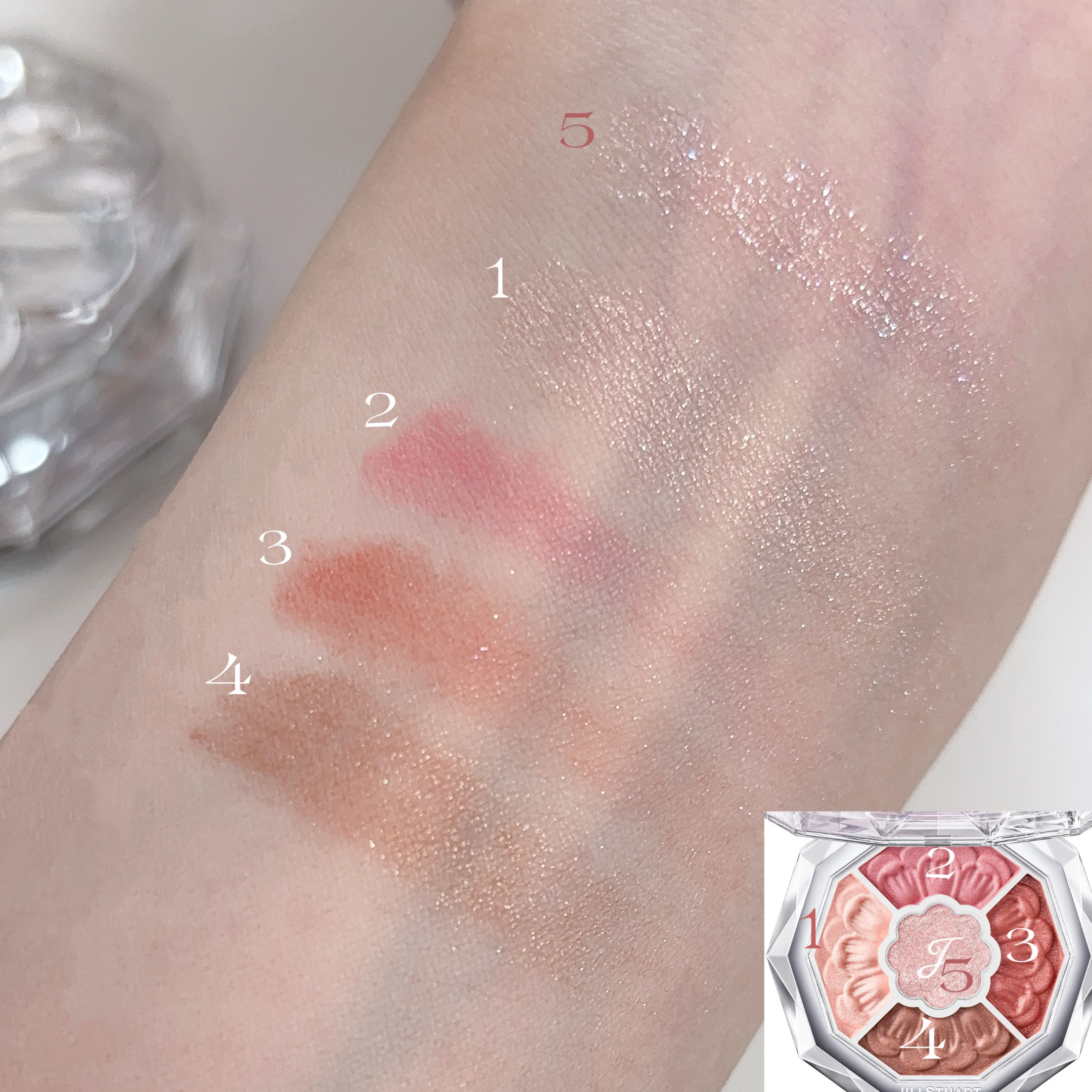 ブルームクチュールアイズと一緒じゃない🤔?って思う方もいると思いますが、違うんだよ💕 ピンクパールが入ったパケになってさらにかわいくなってます😍💖 ブルームクチュールアイズの真ん中はベースカラーだっだけれど今回発売された、ジュエルドブーケはラメカラーになってます💖 発売されてるブルームクチュールアイズは透明感が推しポイントなので透けるような発色が特徴! 今回新たに発売された、ブルームクチュール アイズ ジュエルドブーケはきらめきと発色を推しポイントにしたアイシャドウなので、ブルームクチュールアイズだと発色がちょっと物足りないんだよな🤔 キラキラ好きはたまらないと思うな〜🥺💕 真ん中のみんな大好きなラメカラーは指で塗るのをおすすめします💖 ベースカラーが想像よりキラキラでびっくり😳💖 ブルームクチュールアイズより、パールとラメを増し増しになって よりキラキラになったブルームクチュール アイズ ジュエルドブーケ💕 5色展開のうち限定色は1色♡きっとお気に入りのカラーが見つかると思うのでチェックしてみてください😊💕