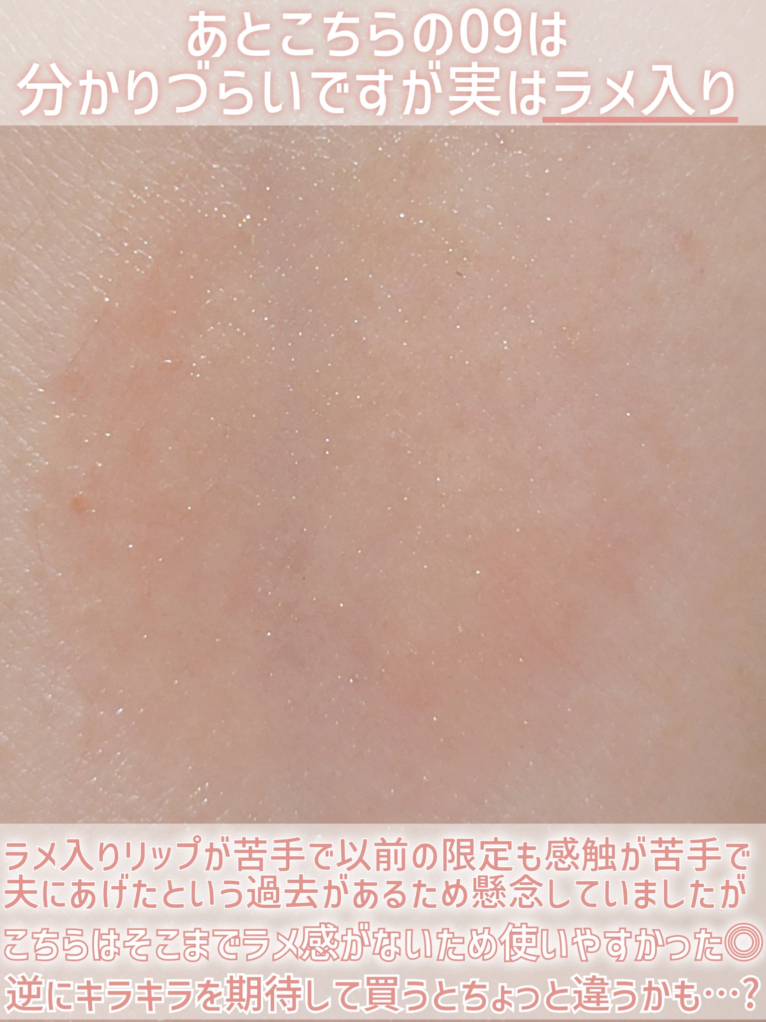 まるでリップクリームみたいな質感でスルスルぬれて保湿感もばつぐん! 色づきはどれもシアー。 ちゅるんとみずみずしい唇に。 08はシアーなクリアレッド。 シアーだからとっても使いやすい赤! 09はピンクやゴールドのパール入りの可憐なベージュ。 ナチュラルでシーンを選ばない。 10はわたしの推しカラー! 青ラメがチラチラ輝くほんのり深みのシアーパープル。 ブルベさんは要チェック💗 全て新色だよ✨