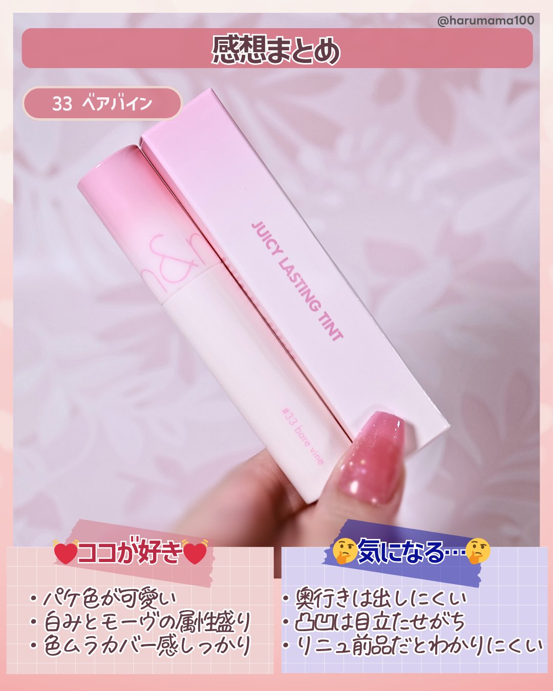 rom&nd ジューシーラスティングティント 33ベアバイン BAREVINE¥1,320このベアバインカラーはとても透け感のあるピンクでとても優しい色です🌸なめらかに密着してみずみずしい唇になりますよ😊ベタつかず、しっとり感が続くコーティン...