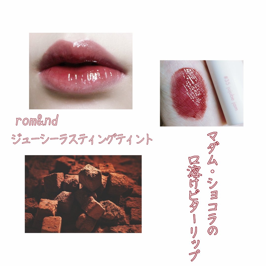 【使った商品】rom&ndジューシーラスティングティント35:ベアジュジュブジャム【色味】黃みよりのレッドかな【色もち】かなり◎【保湿】かなり◎【良いところ】発色がいい乾燥しにくいおちにくいおいしそうな香りぬりやすいパケのグラデーションが可愛...