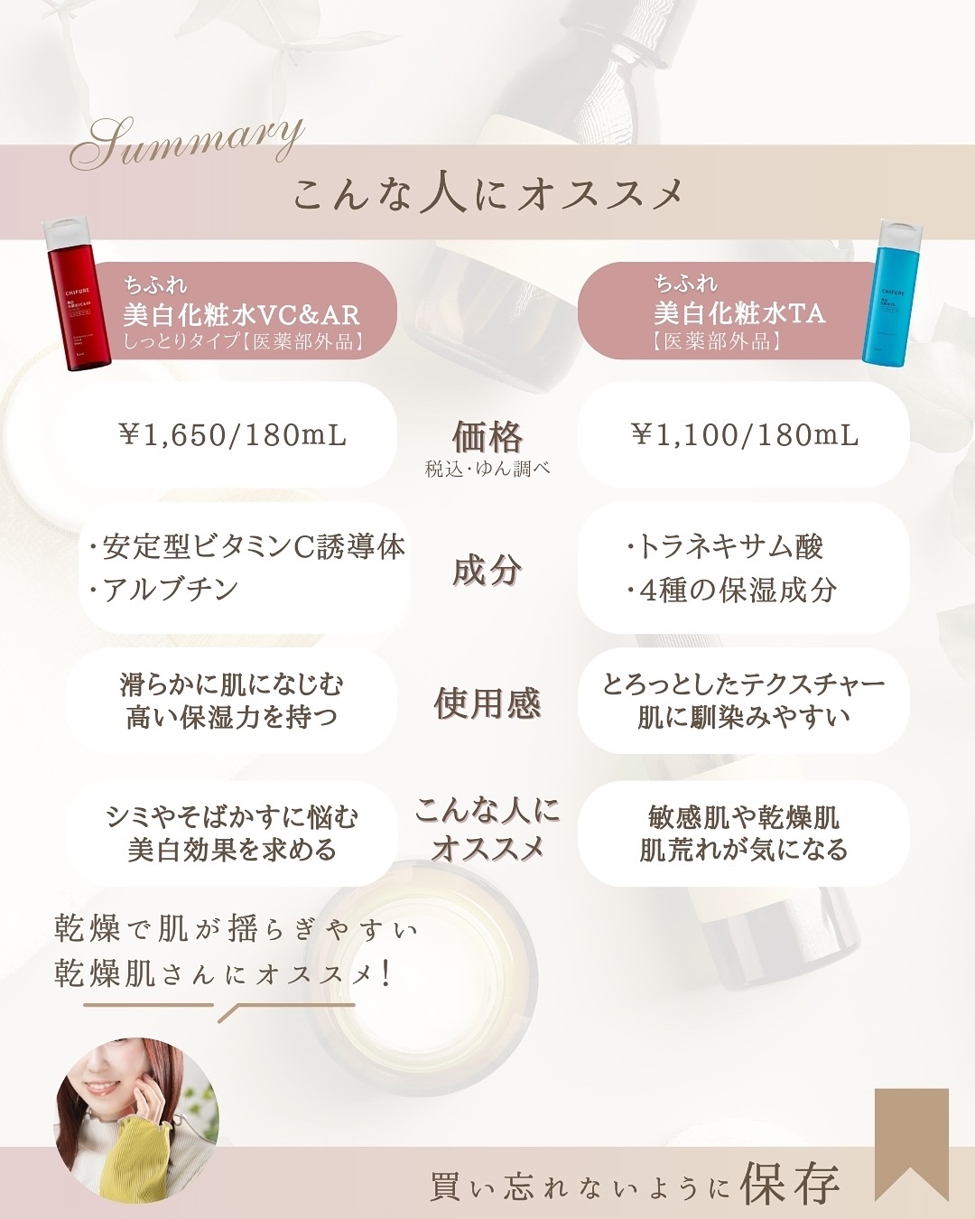 @yun.skincare_👈27年ノーファンデ肌のスキンケア超プチプラの神!ちふれ美白化粧水、どっちを選ぶ?シミ・そばかすに悩む人に人気の2本を比較✨💧VC&AR→ビタミンC誘導体×アルブチンくすみ・毛穴・透明感ケアに◎さらっとタイプ💧TA→トラネキサム酸配合炎症由来のシミ・そばかす予防に◎しっとりタイプ肌悩みに合わせて選んでみてね🧴あとで見れるように「保存」が便利です🌟※価格は全てゆん調べꕁꕁꕁꕁꕁꕁꕁꕁꕁꕁꕁꕁꕁꕁꕁꕁꕁꕁꕁꕁꕁꕁꕁꕁꕁꕁꕁꕁ✦ゆんをフォローするメリット✦☑︎コスパよく褒められ肌を目指せる☑︎化粧品の成分に詳しくなる☑︎自分にあったスキンケアが見つかる☑︎スキンケアが楽しくなる👈ここ大事✦ゆんって何者?✦▹化粧品の処方開発→化粧品企画・マーケティング▹27年ノーファンデ×乾燥肌×薄肌▹愛用品はドラコス&プチプラ多めストーリーでは24時間限定で投稿では言えないぶっちゃけ㊙️情報を公開🫣ꕁꕁꕁꕁꕁꕁꕁꕁꕁꕁꕁꕁꕁꕁꕁꕁꕁꕁꕁꕁꕁꕁꕁꕁꕁꕁꕁꕁ@yun.skincare_👈いいね・フォローとっても励みになります🥹#スキンケア#スキンケアマニア#スキンケア紹介#乾燥肌#ドラッグストアコスメ#ドラストコスメ#プチプラスキンケア#ちふれ#ちふれ美白化粧水#トラネキサム酸#ビタミンC誘導体#シミ対策#美白ケア#化粧水