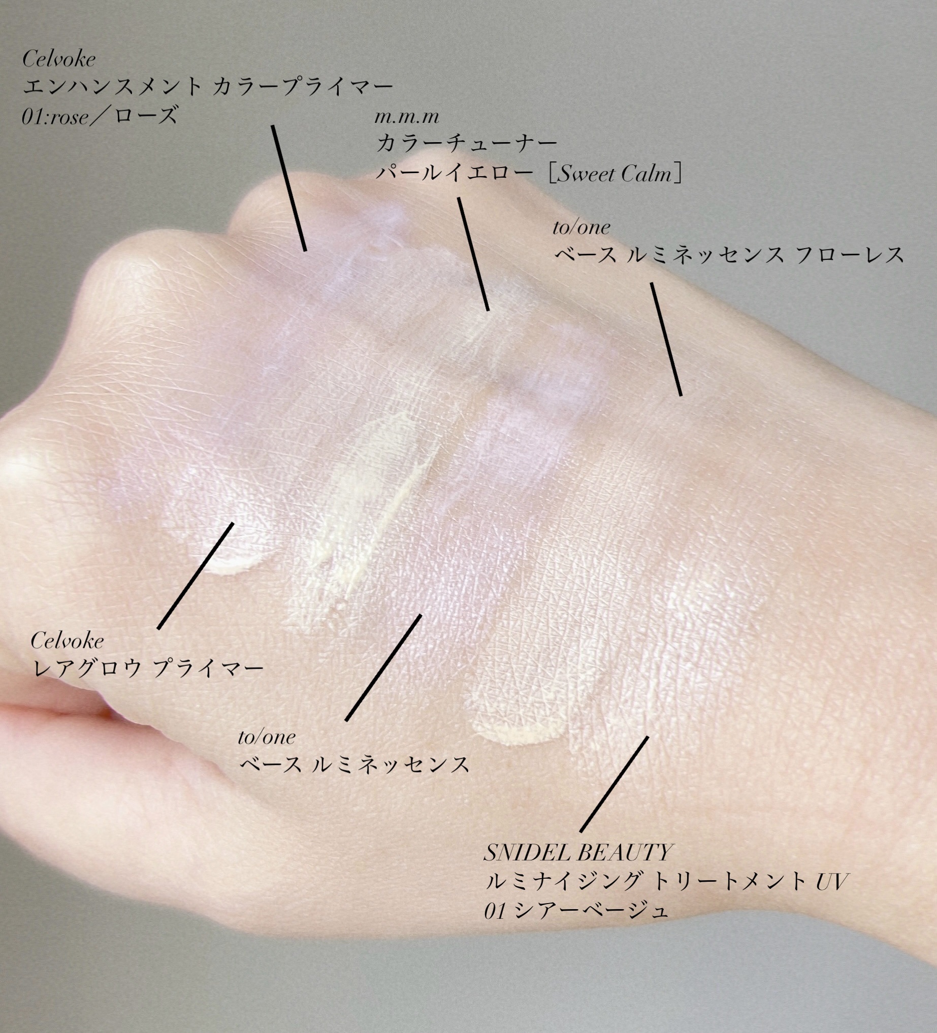 下地マニアのナチュラル系ベースアイテムCelvokeエンハンスメントカラープライマー01:rose/ローズ¥4,180ブルーライト98%カットのエンハンスメントパールの配合されたカラープライマークレンジング不要の下地。こっくりしたクリームのテクスチャーなのに伸びが良く、肌の色むらを補正して血色感を与えてくれます。Celvokeセルヴォークレアグロウプライマー¥4,400Celvokeの新作下地今季トーンアップするピンクベージュっぽい下地がたくさん出たけど、流行っているのかな?こちらもピンクベージュの下地でしっとり感を感じます。m.m.mカラーチューナーパールイエロー[SweetCalm]¥3,520何回もリピしているこちらはイエローのコントロールカラー兼下地。色むら・くすみを整えて均一な肌トーンに。精油の香りも心落ち着く。to/oneベースルミネッセンスフローレス¥3,520こちらが今年の新作。ベージュの下地。サラッとしたテクスチャーでしっとり肌に伸びていきます。従来のものよりカバー力があり、日焼け止め効果が高いのが特徴。重ね付けすると思ったよりもカバーされます。美容成分95%to/oneベースルミネッセンス¥3,520こちらは従来のもの。カラーはピンク私はピンクラベンダーのように感じます♡出した時はフローレスよりとろみがあるのですが伸ばすとみずみずしく薄づき。パール配合で、パールとピンクラベンダーの色味でツヤと柔らかいトーンアップ感があり、可愛い肌に。補正力はそこまでないのでファンデを重ねて使うのがおすすめ。なんと美容成分97%SNIDELBEAUTYルミナイジングトリートメントUV01シアーベージュ¥3,630 こちらもパール入りの下地。02はピンク系。補正力もあるので、肌にアラがなければこれだけでも◯先日snidelbeautyの店舗にお買い物に行った時に使っていただいたものを購入しました。これからじっくり使い込んでいきます。etvosの下地は別で投稿します♡●今季新作が気になる方・Celvoke セルヴォークレアグロウプライマー ¥4,400・to/one トーンベースルミネッセンスフローレス ¥3,520●補正力がある程度欲しい・Celvoke セルヴォークレアグロウプライマー・Celvoke エンハンスメントカラープライマー 01:rose/ローズ・m.m.m カラーチューナー パールイエロー[SweetCalm]・to/one トーンベースルミネッセンスフローレス・SNIDELBEAUTY ルミナイジングトリートメントUV 01シアーベージュ●パール配合・to/one ベースルミネッセンス・SNIDELBEAUTY ルミナイジングトリートメントUV 01シアーベージュ・Celvoke エンハンスメントカラープライマー●カラープライマー・Celvoke エンハンスメントカラープライマー 01:rose/ローズ・m.m.m カラーチューナー パールイエロー[SweetCalm]●UV効果高い順に並べてみたSPF50/PA++++・SNIDELBEAUTYルミナイジングトリートメントUVSPF43/PA+++・Celvoke エンハンスメントカラープライマーSPF40/PA+++・to/oneトーンベースルミネッセンスフローレスSPF22PA++・to/oneベースルミネッセンス・Celvokeセルヴォークレアグロウプライマー・m.m.mカラーチューナー●美容成分の多い順に並べてみた美容成分97%・to/one ベースルミネッセンス美容成分95%・to/one トーンベースルミネッセンスフローレス美容液成分70%以上・SNIDELBEAUTY ルミナイジングトリートメントUV※Celvokeとm.m.mは明確な数値の記載がありませんでした。#celvoke#レアグロウプライマー#カラーチューナー#toone#ベースルミネッセンス#ベースルミネッセンスフローレス#snidel#ルミナイジングトリートメントUV#ナチュラルコスメ#ベースメイク#私のお悩み解消メイク術