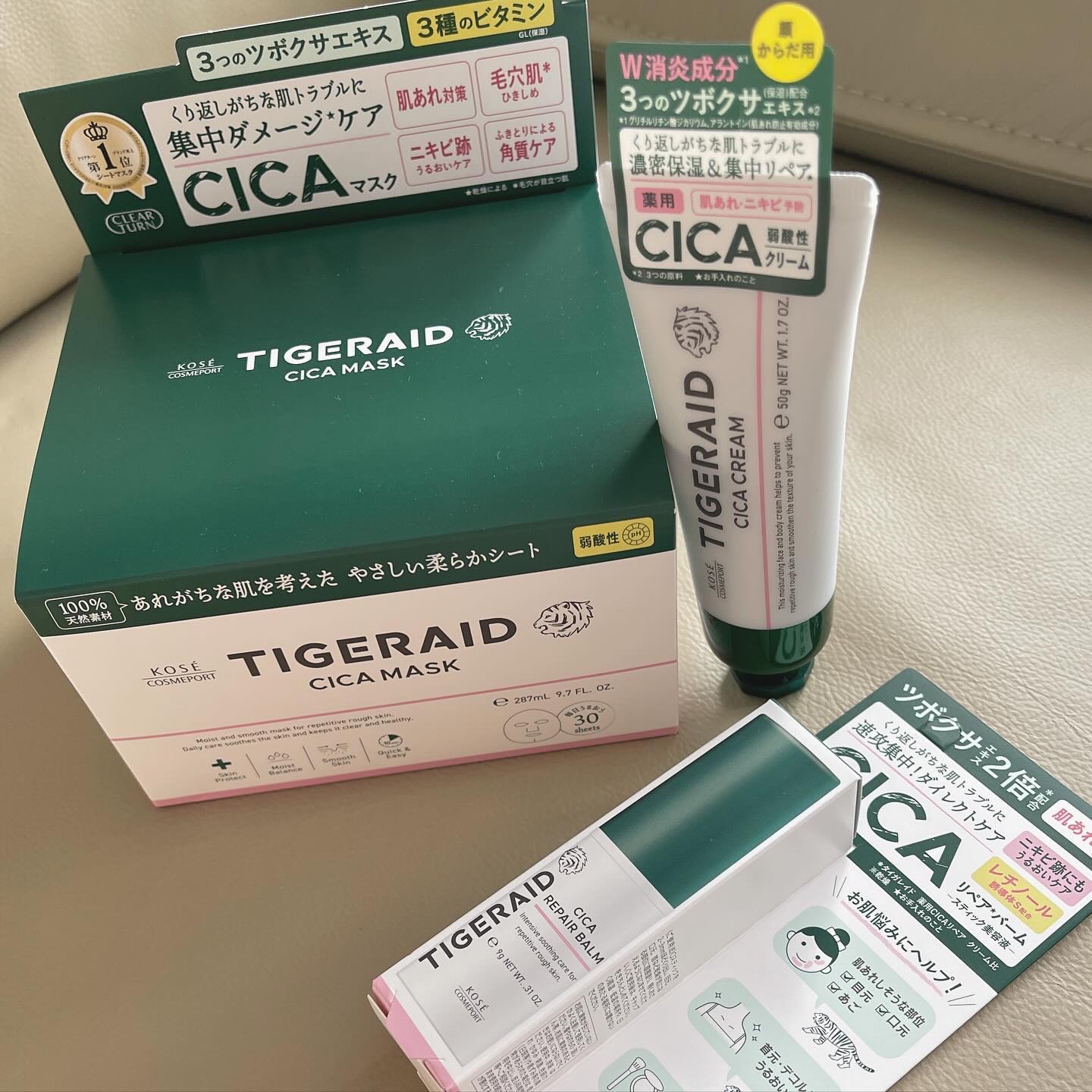 ==========================TIGERAID■クリアターンタイガレイドCICAリペアマスク■薬用CICAリペアクリーム■CICAリペアスティックバーム==========================@cchannel_lemonsquare様を通じてタイガレイド様からタイガレイド3点セットをご提供頂きました😌🤍この度は素敵なお品をありがとうございます🙇♀️--------------------------■クリアターンタイガレイドCICAリペアマスク(30枚入)3つのツボクサエキス*ビタミン・GL(保湿)を配合し 外部刺激により荒れた肌をケアしてゆるがない透明ツヤ美肌へと導くCICAリペアマスク*ツボクサエキス、ツボクサ葉エキスマデカッソシド(保湿)自然由来成分をベースにした美容液が角層奥のすみずみまで浸透しお肌を潤いで満たして外部刺激に揺らがない肌作りをサポートします■薬用CICAリペアクリーム(50g)ダブル消炎成分*を配合し繰り返す肌トラブルに集中アプローチして濃厚なクリームテクスチャーでお肌をしっとりと保湿ケアするCICAリペアクリーム*グリチルリチン酸ジカリウム、アラントイン(肌荒れ防止有効成分)お顔だけでなく、身体にも使える弱酸性クリームで肌荒れ、ニキビを予防し健やかな肌へと導きます■CICAリペアスティックバーム(9g)ツボクサエキスを2倍*配合し繰り返しがちな肌トラブルにダイレクトケアするCICAリペアバーム*タイガレイドCICAリペアクリーム比レチノール誘導体と乳酸菌発酵エキスS(保湿)を配合しハリツヤ溢れる透明美肌へと導きます--------------------------今回タイガレイドさんのCICAリペアライン3点をお試しさせて頂きましたがリペアマスクはサラッとした美容液をシート一枚一枚がたっぷりと含んでいてシートマスクを剥がした後もベタつかずにサッパリとした使用感でした😊目周りのカットが小さめなのでギリギリまでフィットしやすく天然素材100%使用の柔らかいシートが肌触りが良くて毎日使いたくなる心地良さでした✨️クリームはわりとしっかりめのテクスチャーで肌に馴染ませると濃厚なしっとり感がありめちゃくちゃ肌が保湿されている感じがします😳まさに乾燥する冬場にピッタリで乾燥によって肌荒れしやすい方におすすめのクリームです😊CICAリペアスティックバームはいつでもどこでもサッと使えるだけでなくお顔以外の首元やデコルテひじやひざにも使えてとっても便利だししっとりとした仕上がりになるのにベタつかないので、メイク後の保湿にも使える万能バームでした👏✨️個人的に使用感も好きだしほんのり天然ハーブの香りもお気に入りです🤭💓#PR#lemonsquare🍋#タイガレイド#TIGERAID#CICA#ツボクサ#薬用#スキンケア