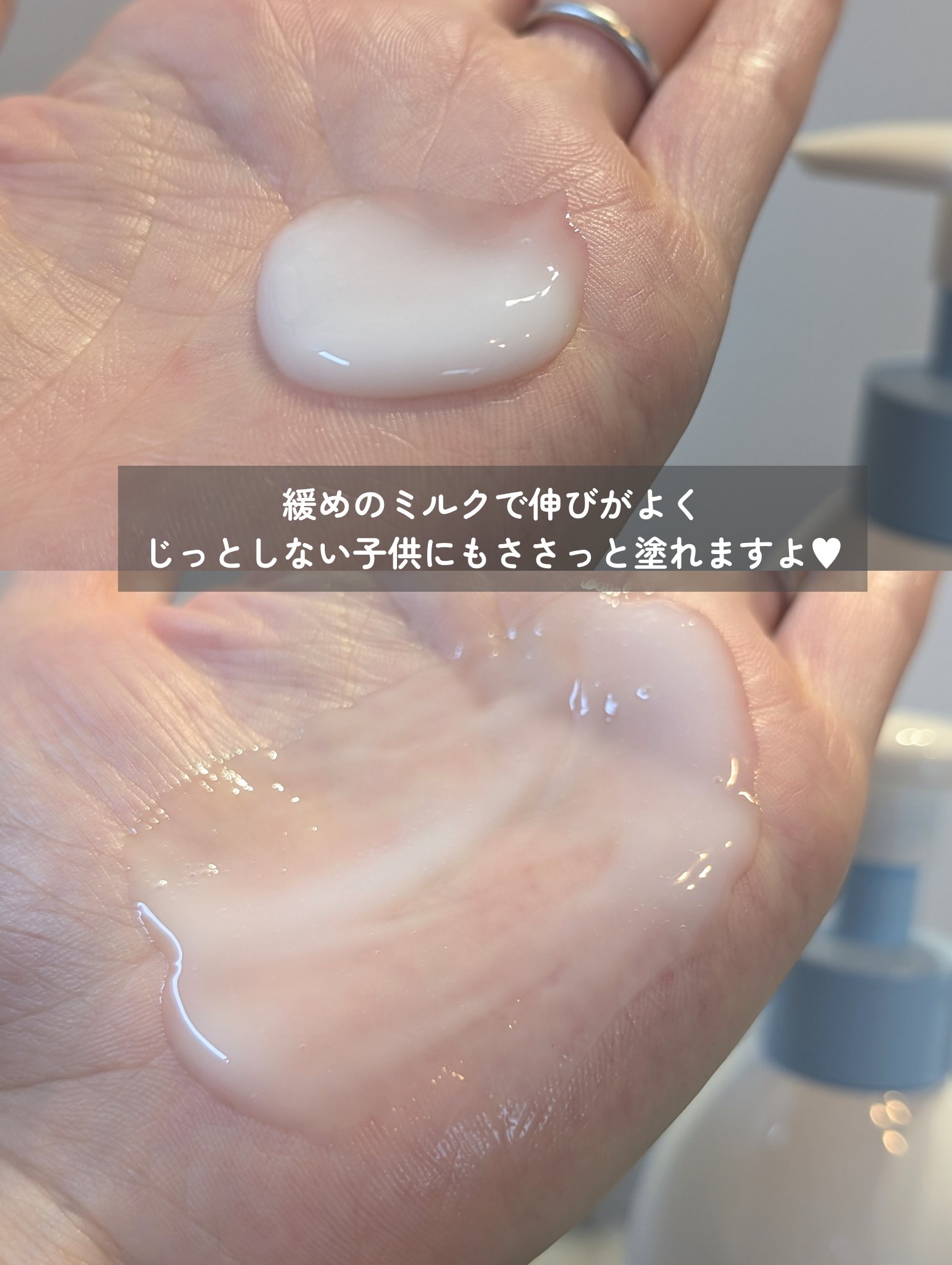 テクスチャーは乳白色で乳液状です。 お風呂あがりにつけても、すっとなじんでべたつかないタイプです💙 5歳の娘もお気に入りで一緒に使用しています💖 医薬部外品の有効成分として、肌あれ、ひび、赤ぎれを防ぐグリチルレチン酸ステアリルを配合しているのも良いですね✨ 夏はもちろん秋冬の乾燥が気になる時期にも使い続けていきたいです🌿 乾燥が気になる方 腕や足などの粉ふき 敏感肌や赤ちゃんのデリケートな肌の方 このような全身保湿ミルクをお探しの方にオススメです😊