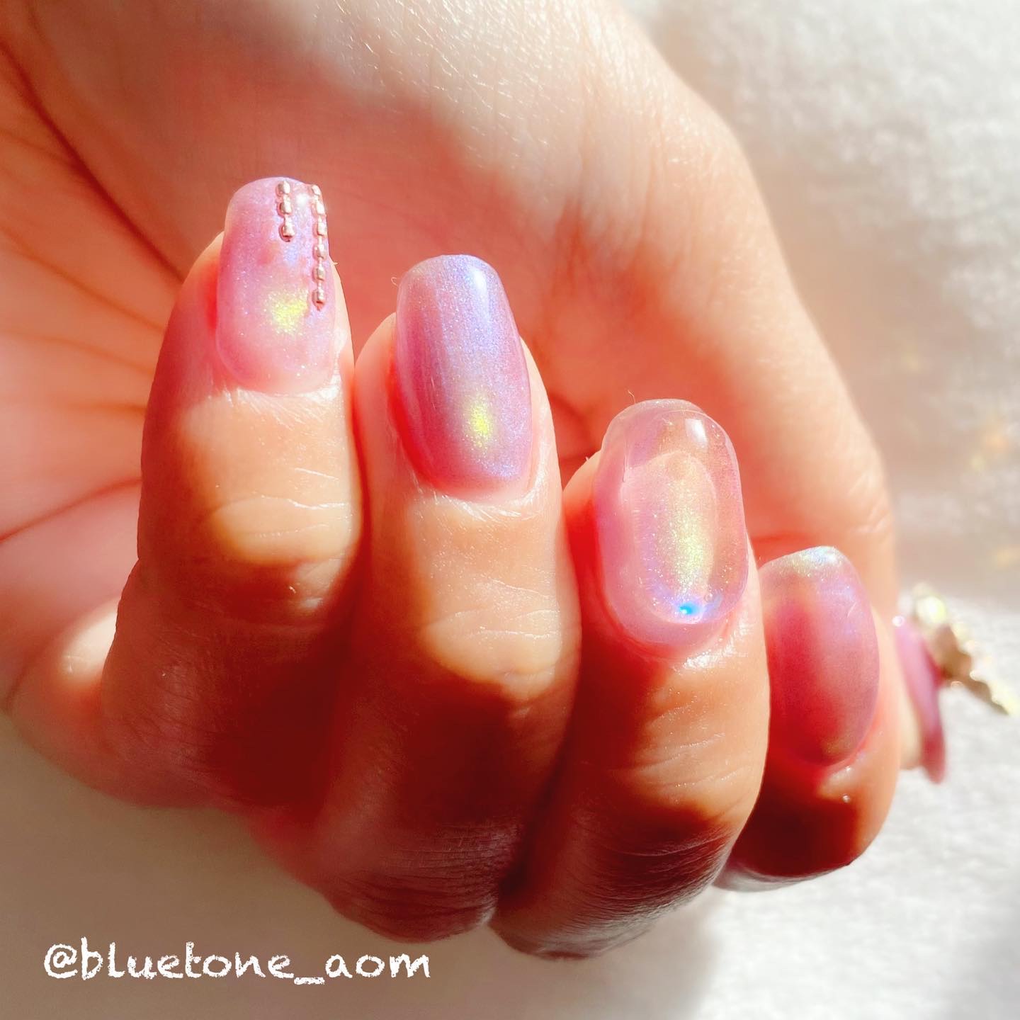 光当たりすぎて ちょっとカラーはわかりにくいけど 光り方とかたまらぬ…🥺 やはしMoonlight magnet 08は最高ですね🥹 もう迷ったらとりあえずこのカラー使っといたら 私のテンションが上がる(笑) パールラメのカラーが淡いから うるうるパーツとの相性も良かったよ☺️