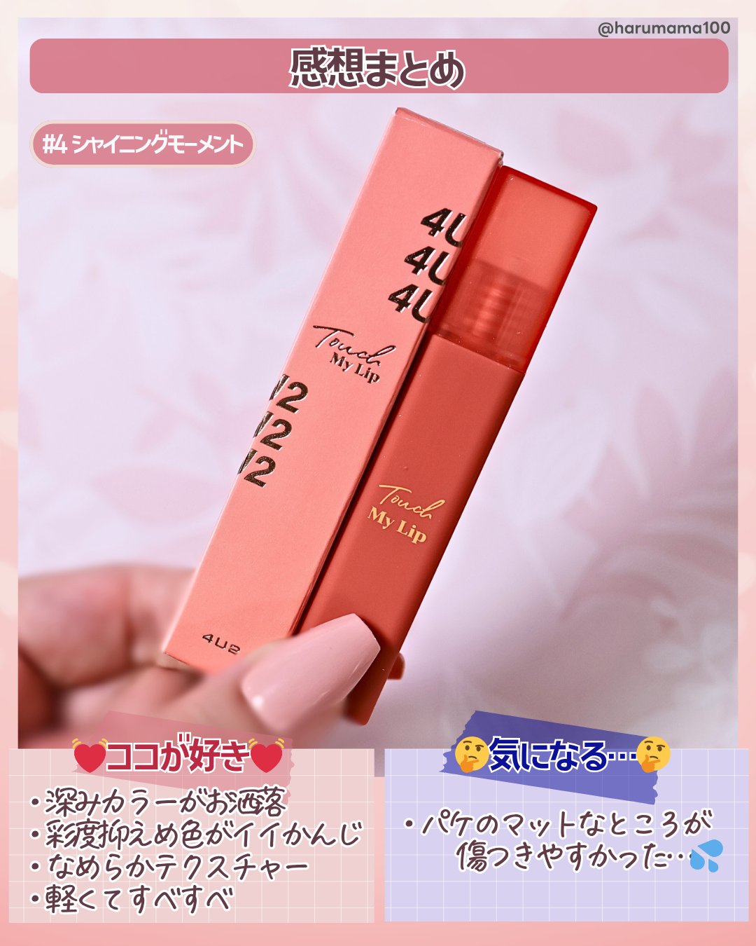 【やわふわムース♡マットな赤みブラウンリップ】───────────────4U2タッチマイリップ#4シャイニングモーメント参考価格748円(税込)───────────────タイ発コスメブランド「4U2」のリップ♪これ、マツキヨとかのドラストにもあったりするらしい〜!柔らかくふわふわなムーステクスチャーが特徴的でなめらかにスルン!とふっとするの。すべすべの肌ざわりで…ついつい”ンーマッ”ってしたくなる…!!私が選んだカラーの「シャイニングモーメント」は彩度を抑えた赤みブラウン。ちょっぴり落ち着きがあってオシャレだよ!大人っぽく仕上げたいときにオススメ♡───────────────#コスメ購入品#내돈내산#4U2#フォーユーツー#タイコスメ#リップメイク#リップ#マットリップ#lip#プチプラ#ドラコス#こっくりカラーコスメ