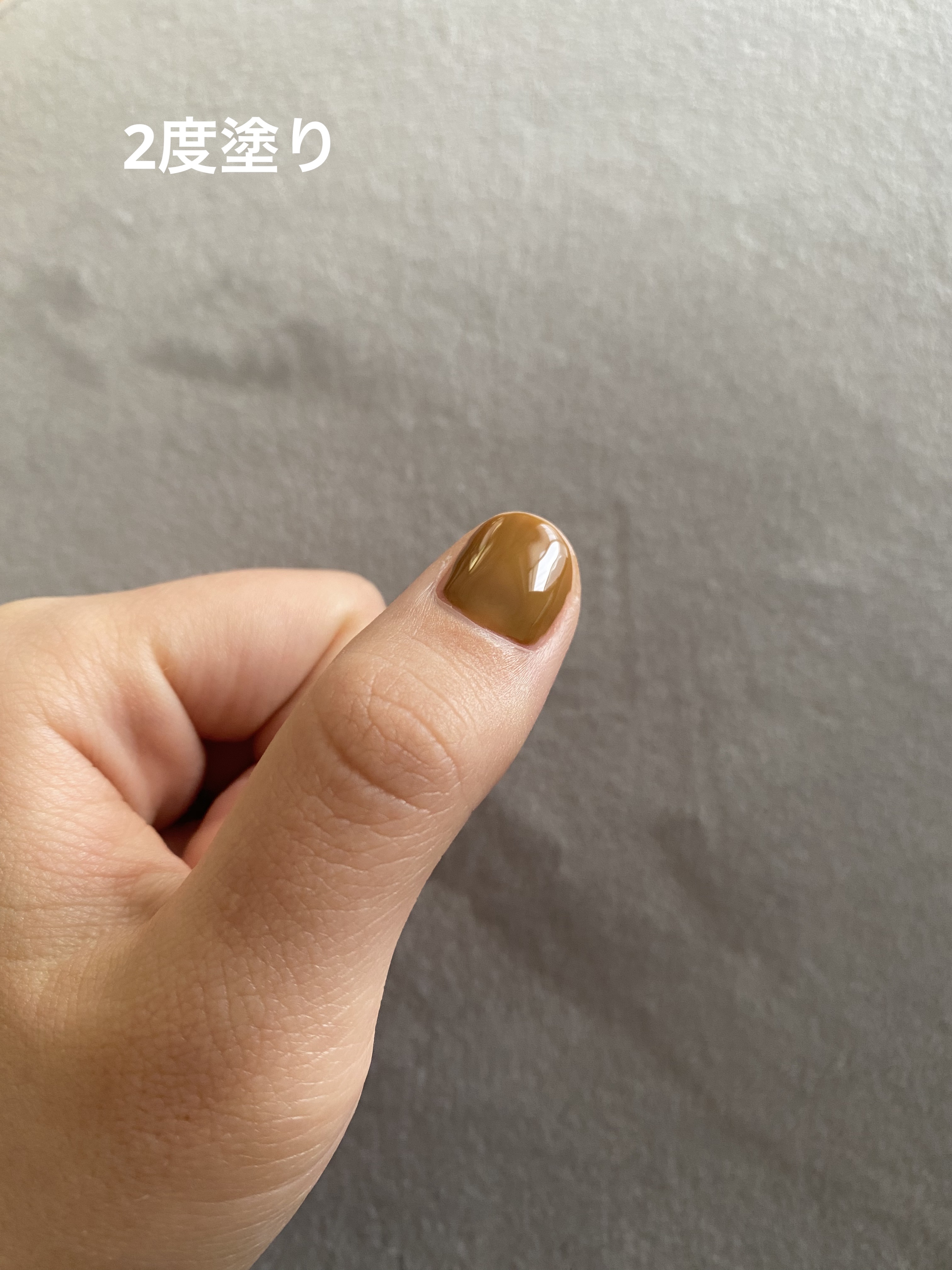 実際付けてみるとキャラメルに近い色味で これはこれで可愛かった✨ 個人的には1度塗りの薄目が手に透明感もでて 綺麗に見えた🥹 キャンメイクのネイルは安いのに、自然光でツヤ感もしっかり出るから高級感あるのも おすすめポイント✨