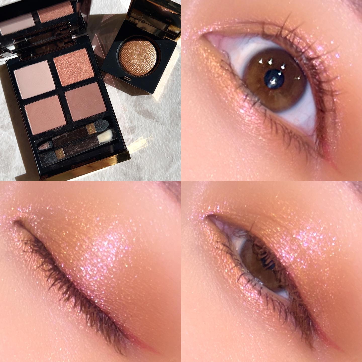 かなり発色、ラメの色がしっかりしてる 偏光ラメで見る角度によってゴールドにも 青みがかったピンクにも見える 一度塗りでもまぶたにピタッと密着します ナチュラルメイクより、 ホリデーメイクに向いている印象 このアイシャドウ一つでガラッと雰囲気を変えられる ラメの偏光感が伝わるよう、動画多めに載せています! 結婚式の時に衣装チェンジする時このアイシャドウと アイラインを足すだけでかなり雰囲気が変わりました✨ 他にない偏光ラメなので、ちょっといつもと 違うメイク、個性を出したい方にオススメです! また、密着度が高いため しっかりクレンジングや洗顔しないと落ちにくいです💭 使い方を間違えるとかなり派手になってしまうので たまに休日使う時はさっと一度塗りして フレームラインはマットなアイシャドウをして 少し落ち着かせています(^^)