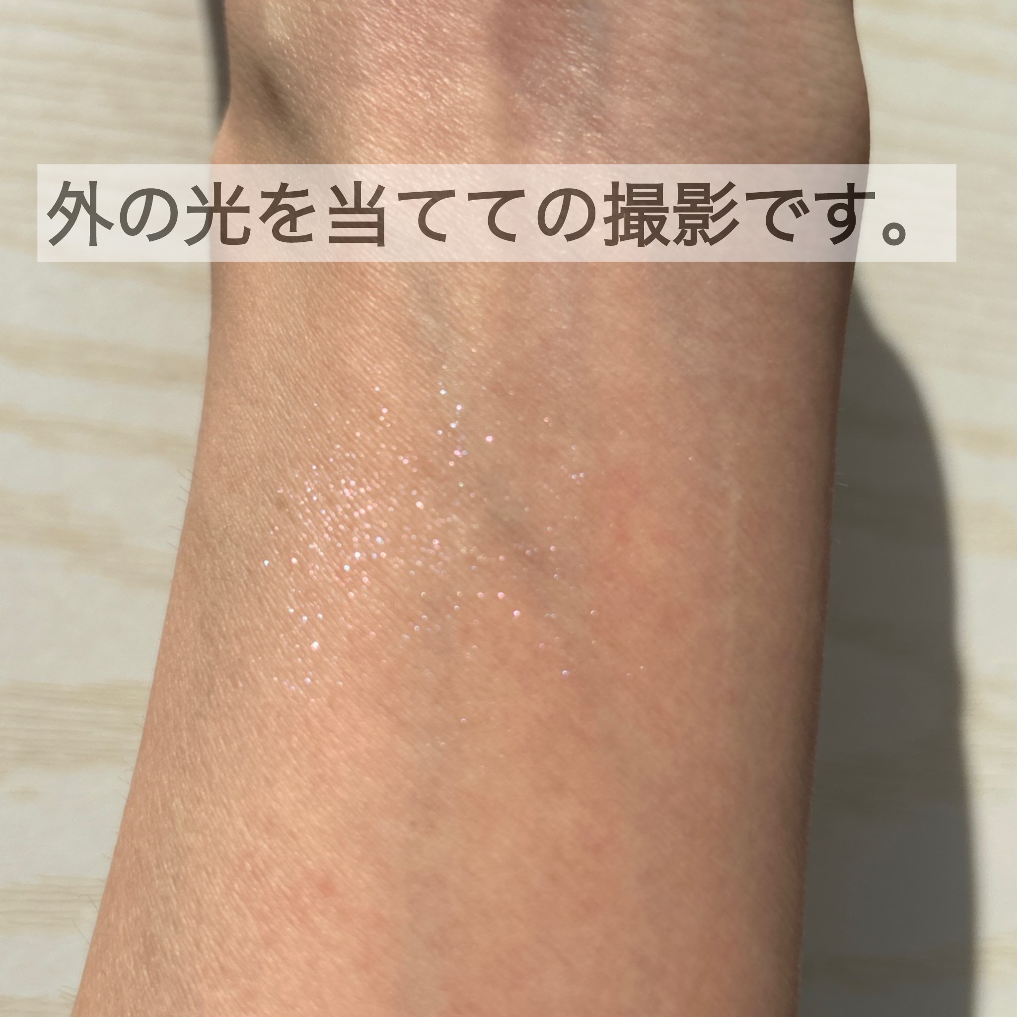 このカラーが私は今回の3色の中で1番ヒット♡ ホワイトベースにピンクやブルーなど様々なカラーに輝き華やかな瞳に。 ホワイトベースだけどベース自体はほんのり発色で角度によって色が変わって見えるジュエルグリッターがオーロラみたいでとっても可愛いの! 涙袋に入れてもキラキラしてるし、最後に黒目の上に乗せるとベースがどんな色でも可愛いと思う! ラメやホロが大粒のグリッターとはまた一味違って一粒一粒繊細なのがいいなと思いました。 持ちが良くて落ちにくい。むしろオフしてトナパで葺いてたらまだキラキラしてた(笑)