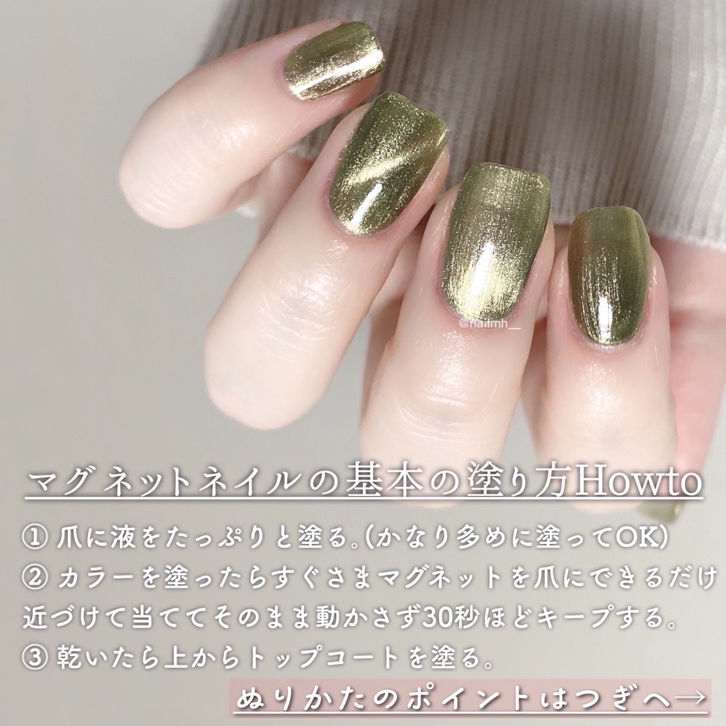 こちらの030 EXOTICはピスタチオグリーンベースにマグネティックパールが輝き、アンティーク調なゴールドっぽさもあるオシャレな色合いになってます! マグネットの細い面を近づけるとパールがシャンパンゴールド〜グリーンゴールドっぽく輝き、マグネットの太い面を近づけるとノンパールに近い深めのピスタチオグリーン〜ダークカーキっぽい色味になります。 速乾性が高めで乾いたら模様がつくれなくなってしまうので、とにかく液をたっぷり塗布することと、とにかく塗ったらすぐマグネットを当てること。 トップコートを塗った後もすぐにマグネットを当てること。なぜかトップコートを塗ってしまうと少し模様が崩れてしまうので、トップコートを塗った直後も素早くマグネットを当ててあげると◎ ジェルでのマグネットネイルのようにマグネットを動かしながら模様を作るのではなく、マグネットをしっかり固定して作る柄が1番綺麗にマグネットの良さが出る。