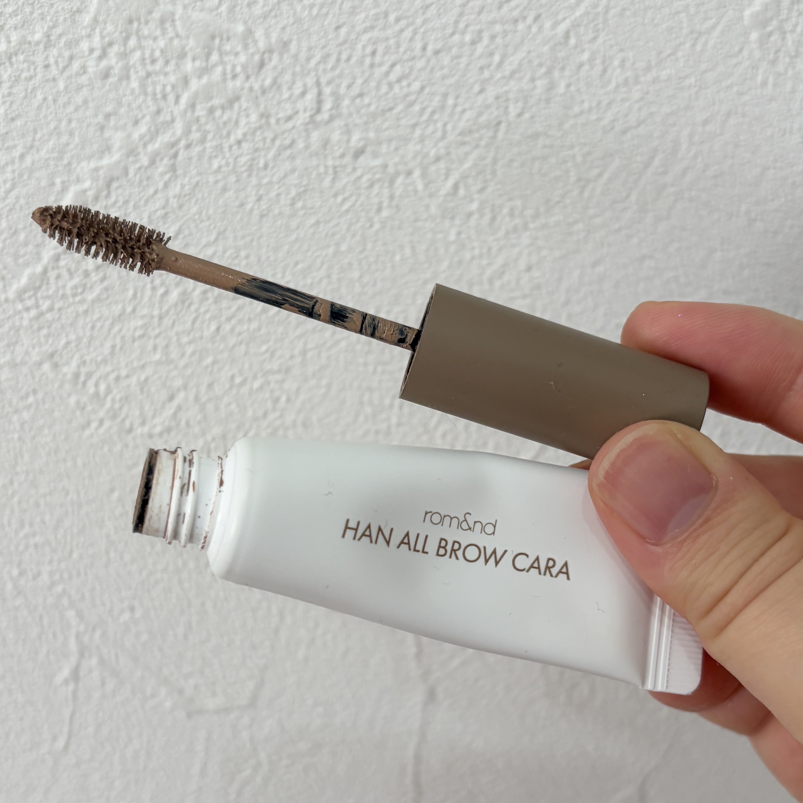 rom&ndハンオールブロウカラ03モダンベージュMODERNBEIGE¥1,210#韓国コスメ#プチプラ#眉メイク#垢抜け#眉カラー#眉マスカラロムアンドの眉マスカラ初めて買ってみたんですけど思ったよりも良かったです!!前まで別の眉マスカラを使っていたんですけど、それよりも色がしっかりとついて、満足です♩♩ただつけすぎちゃうとべちゃっと感が出てしまうのが残念です🥹🥹でも今まで買った眉マスカラの中で1番よかったです😭😭