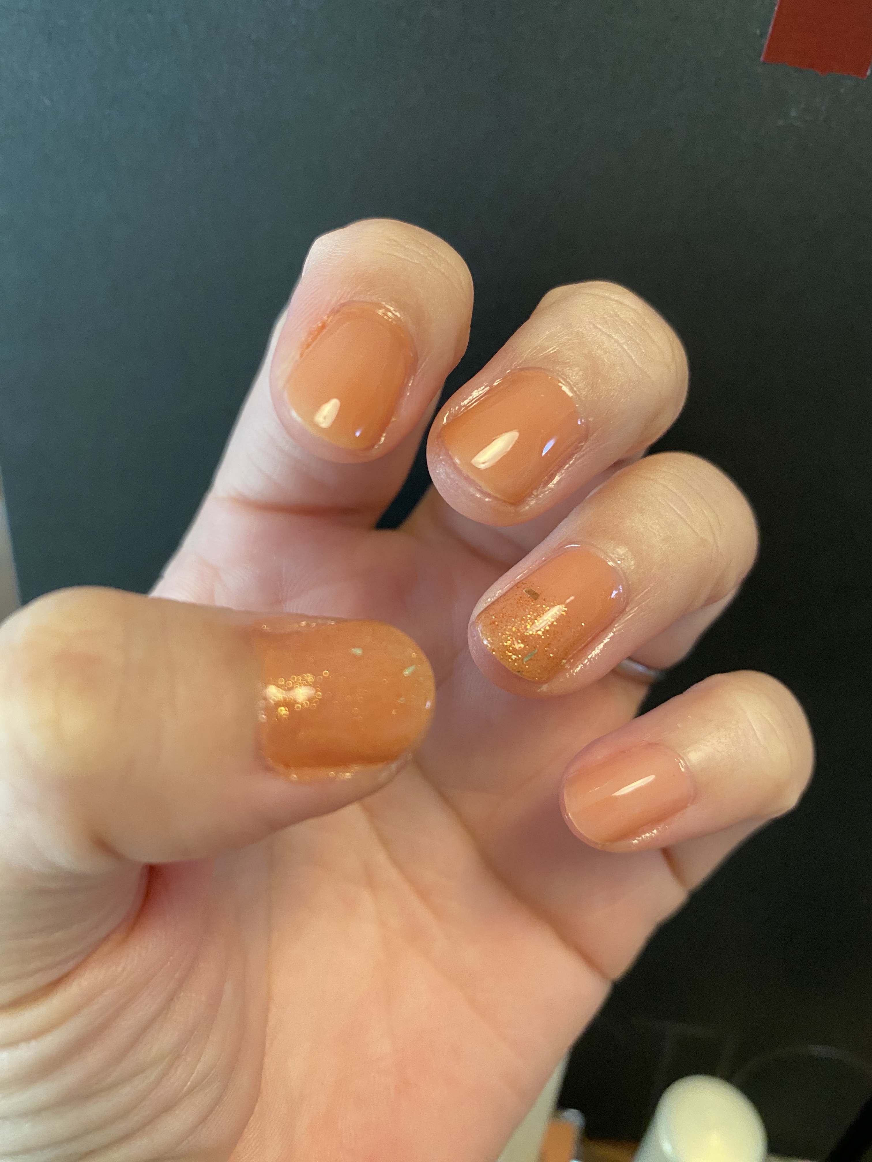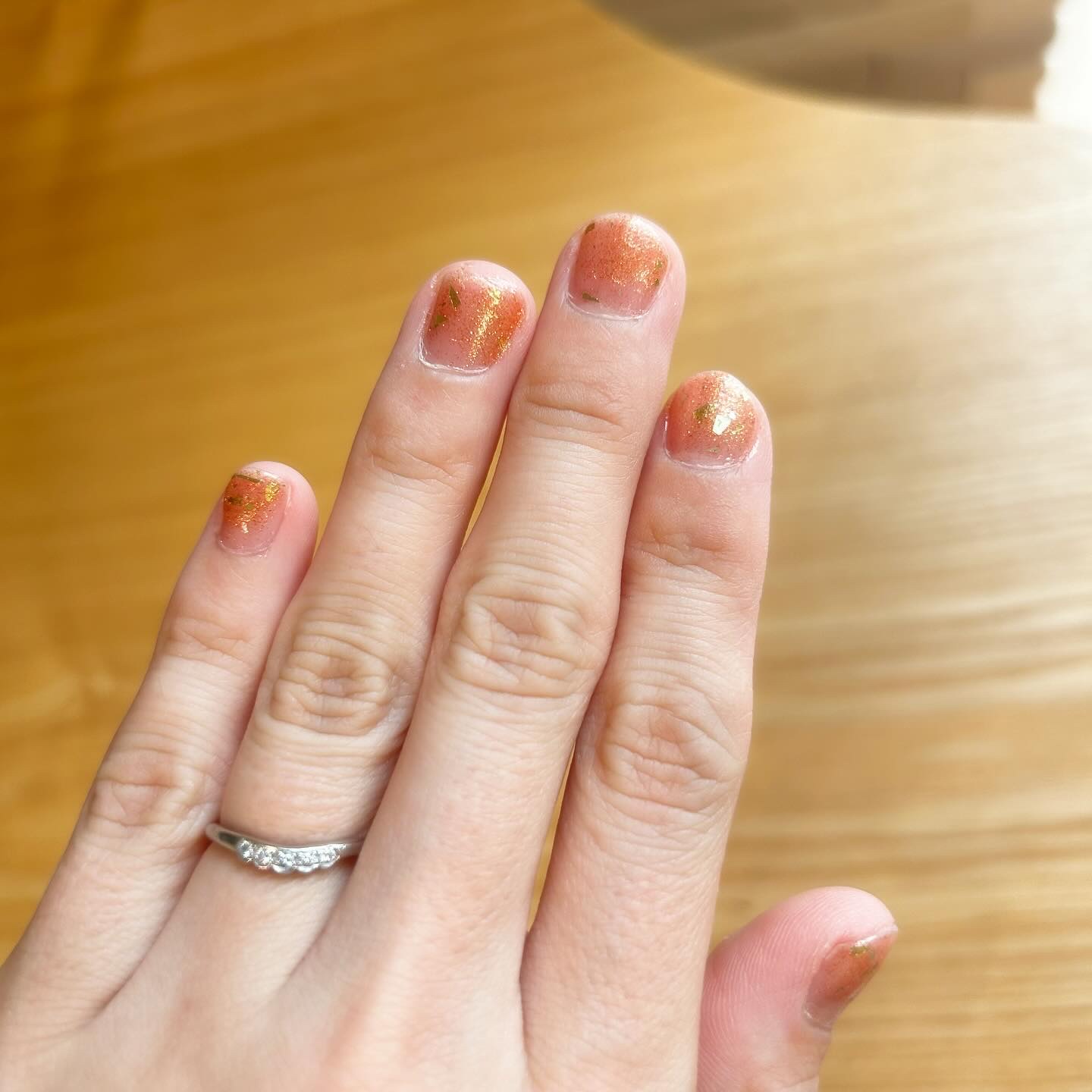 オレンジがかった細やかなラメと金箔っぽい少し大きめのラメが入っていてとても可愛いんです☺️💗 地味めなカラーをベースにしても これを重ねると一気に華やかになります💃 本当に買って良かった🌷 これはリピートしたいと思います◎