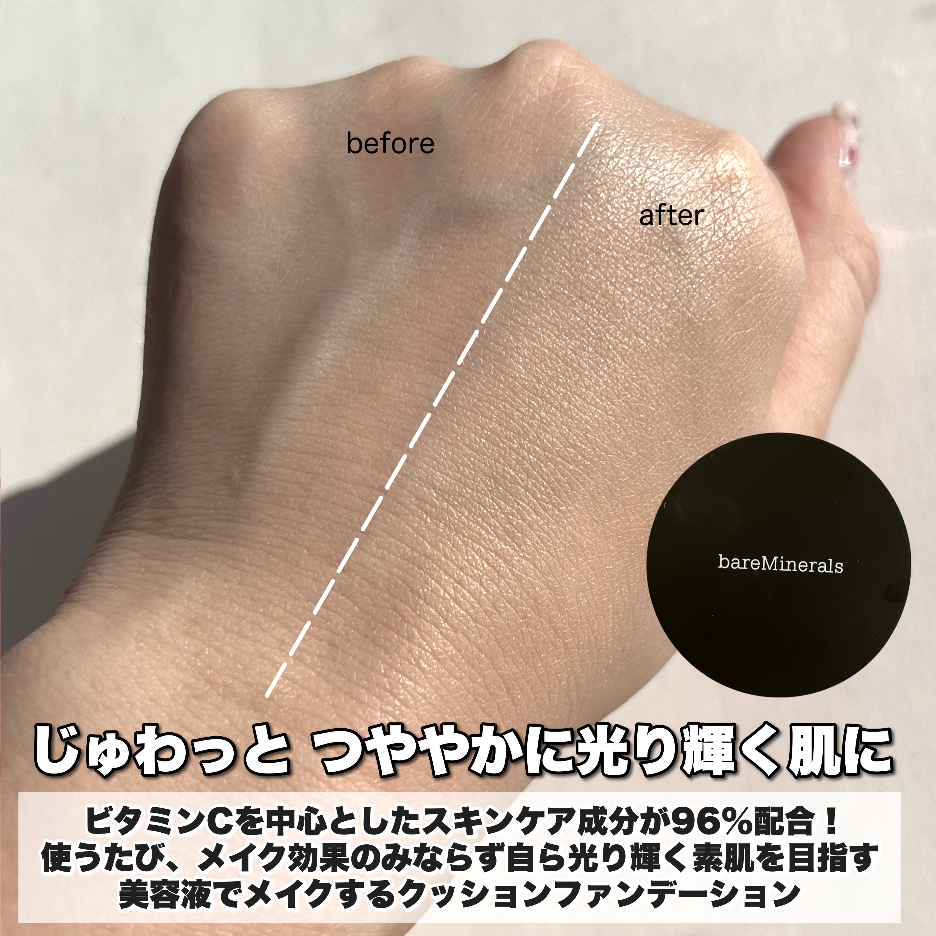 芯からあふれる、ピュアな光 瞬時に、そして使うほどに明るく 澄み渡る肌へ導く美容液クッション 植物の恵みを中心に、スキンケア成分を96%も含み、芯から晴れ渡るような明るくツヤやかな印象に導く美容液のようなファンデーションです ノンコメドジェニック / アレルギーテスト済 / 皮膚刺激性テスト済 ベアミネラルのコンセプトである、まさに「つけないよりも、肌に良い。」を体現したクッションファンデです 実際に使ってみると、みずみずしい使用感でツヤ感がとても綺麗でした スリムなコンパクトケースだから持ち運びにも便利で、お直しコスメとしても使えるのが良かったです