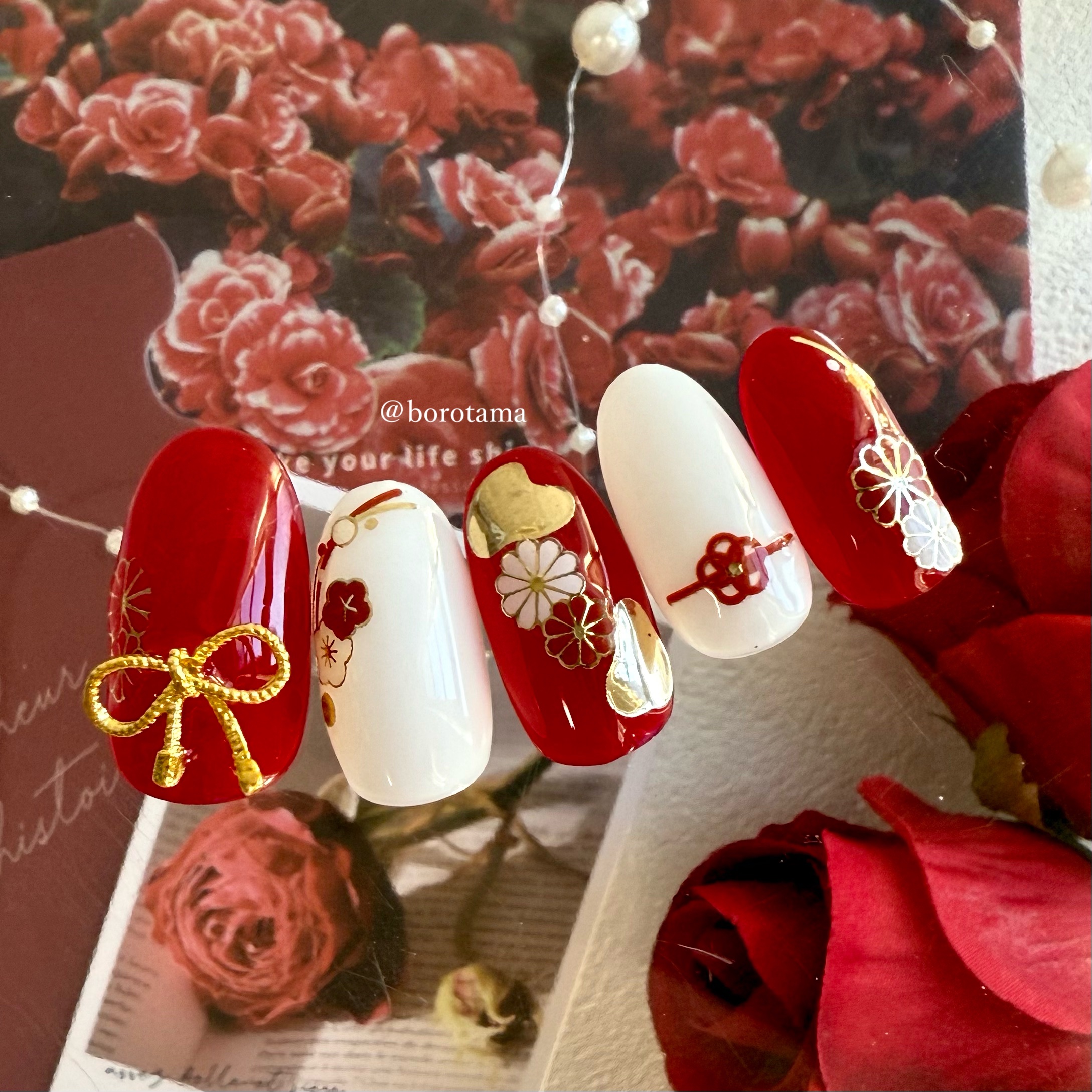 ちふれのマニキュアを使って和ネイル💅 ちふれ以外のアイテムは100均で揃うのでチェックしてみてね〜! このリボンのパーツも和装に合って可愛い💝 パーツは取れやすいので、ネイルグルーとかでしっかりくっつけちゃうのがおすすめです。 やっぱり紅白のおめでたいカラーが好きかな❤🤍 お正月休みもっと続いてほしいー!