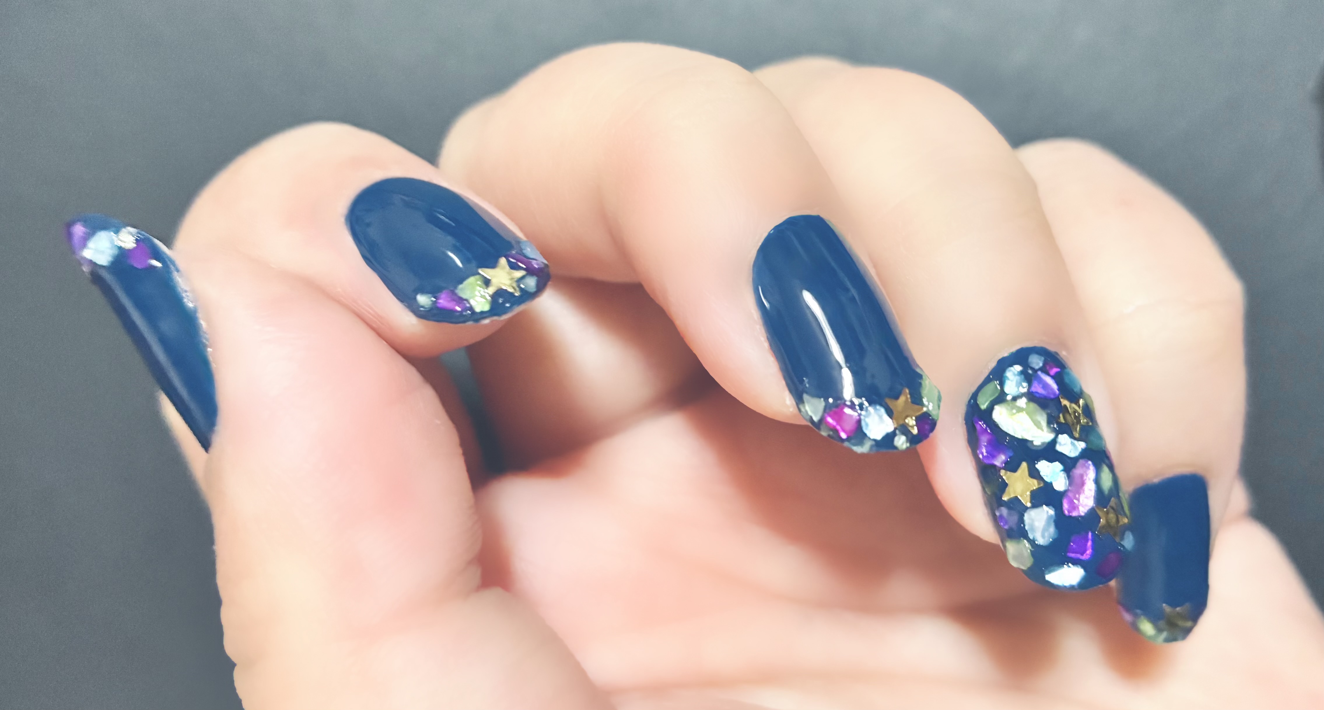 プチプラポリッシュだけ💙夏にぴったり夜空ネイル🌌Howtoは3枚目に😘人差し指は007番を2度塗り、小指は971番を2度塗りして、それぞれ爪先にPLB15番を重ね塗りしました✨人差し指の根元に貼ったシールもキャンドゥのシールになります🙌🏻少し...