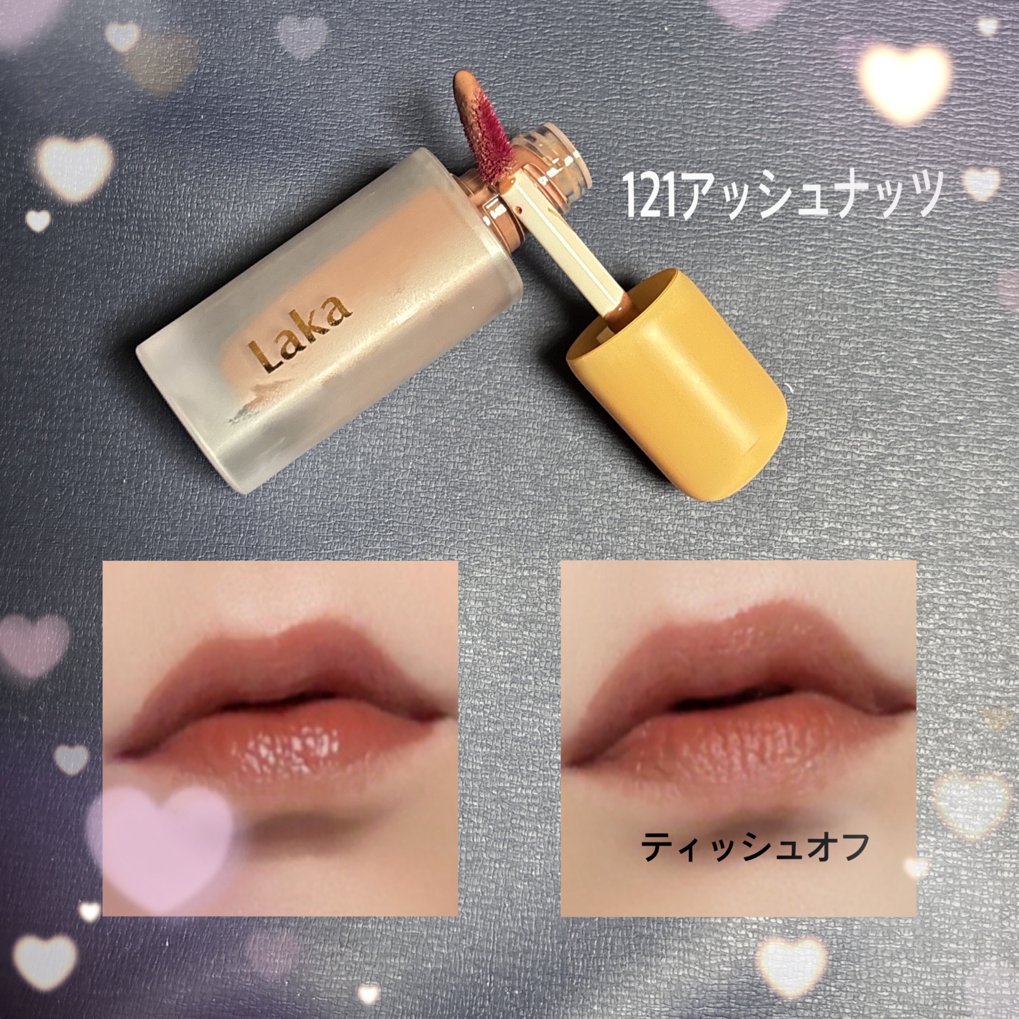新色のアッシュナッツが日本の店頭でも発売開始されます くすんだアッシュカラーでおしゃれすぎる 夏〜秋みたいなカラー 唇に乗せると私の場合は少しトーンダウンしたようなカラーになります 透け感のあるカラーなのであまり色が強く付く感じではないです ティッシュオフすると茶色ぽい感じの色の残り方で赤みが強くなったりもしませんでした lakaのリップの艶感がすごく好きで 艶感あまり得意な方では無いのですが 塗り心地ともに気に入っています