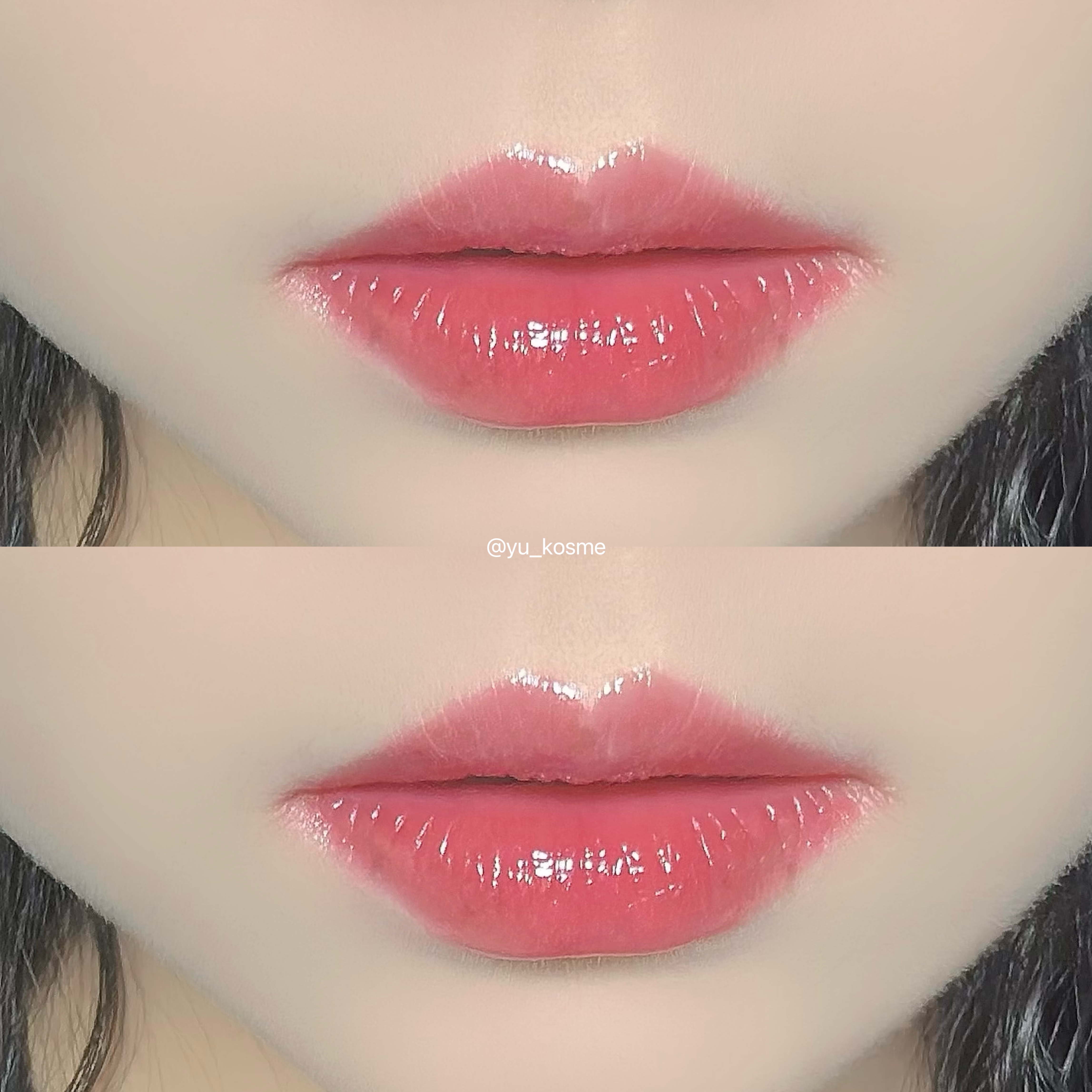 とにかくプルプルの唇になれるのと、ブライトピンク系のカラーなのに派手過ぎず日常使い出来る明るさで血色も良く見せてくれます。 元の唇の色と比べると結構色が凄い事になってますが実物はもう少し唇に馴染んでて落ち着きます。
