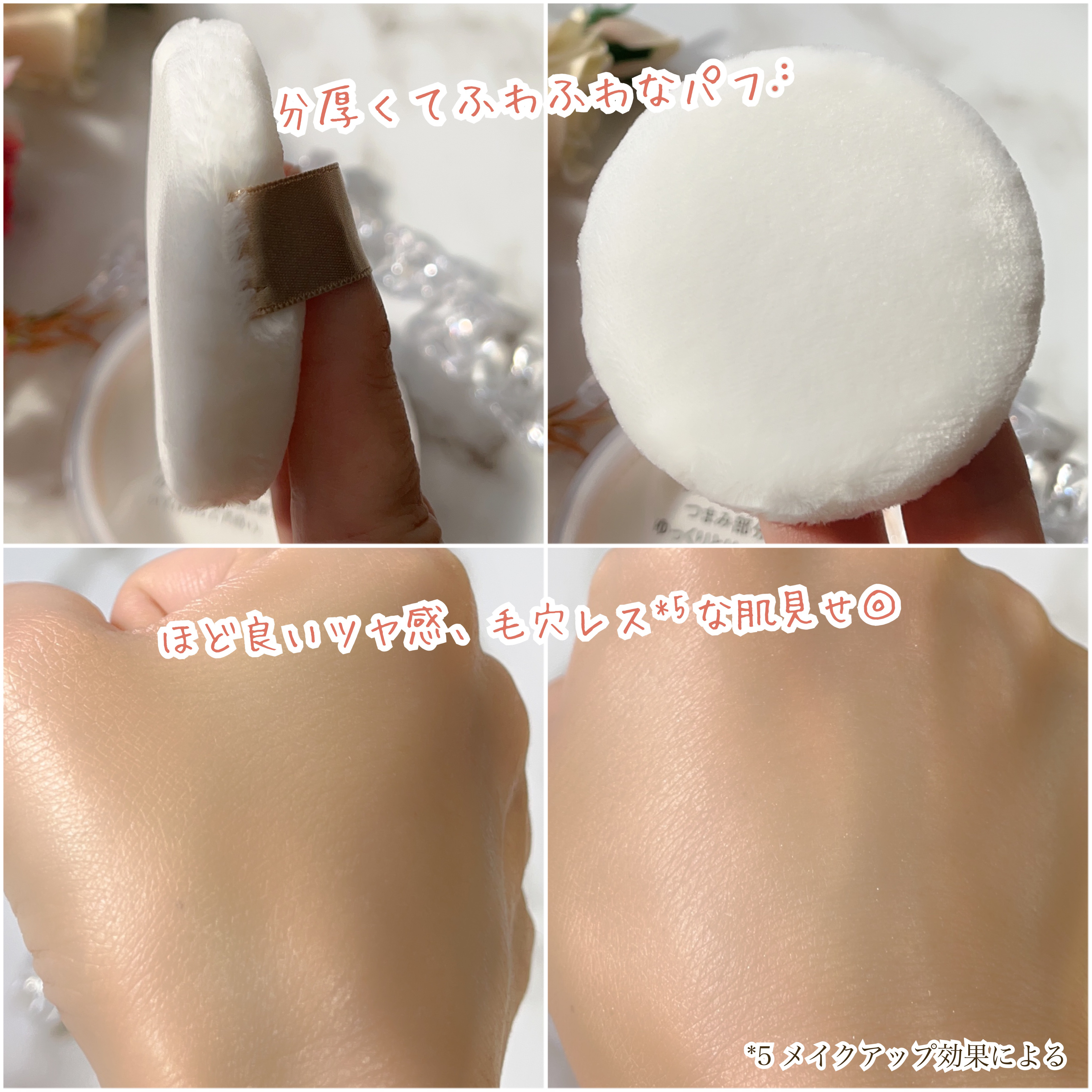 こちらは全3色で、今回私が試したのは中間の色味。 するするっと伸びが良く、コンシーラーとして肌の色々な気になる部分もちゃんと隠せる💡´- SPF36/PA+++と、日常生活には問題ないUVカット効果があるのも嬉しい😳 これ、オレンジベージュもあるみたいなんでちょっと気になってます🥺 そしてラベンダーの良い香りがするところがとっても気に入ってる❣️ 3種のヒト型セラミド*7と、こだわりの植物成分*8配合でお肌にうるおいを与えてくれる🥰 リッチなテクスチャーでお肌をふんわりとまとい、素肌から輝くような仕上がりを演出💡´- エアリーなオイルリッチパウダーで、しっとりしているのにべたつかない不思議な質感🥺 パフが分厚いので、使い心地もとても良いです。 パウダーをはたくと透明感のある*4毛穴レス*5な肌に見えるのがお気に入り❤︎.*