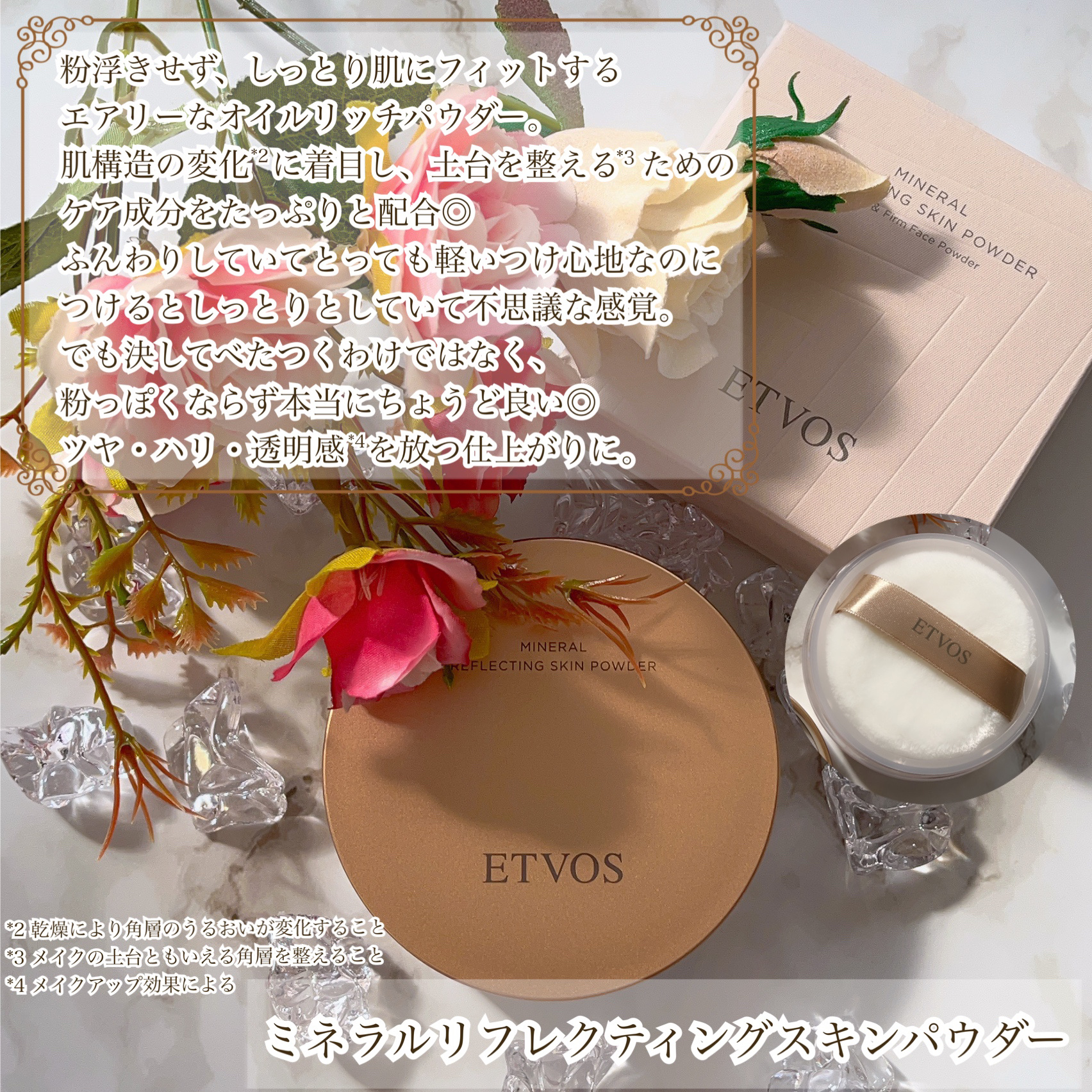 ✔@etvos.jp ミネラルリフレクティングスキンパウダー ルーセントエクリュ しっとりうるツヤ肌に導くスキンケア発想のフェイスパウダー。3種のヒト型セラミドと、こだわりの植物成分配合でお肌にうるおいを与えてくれます。 パウダーもパフもふんわりと軽く、付けた肌はしっとりと柔らかく、透明感のある印象に仕上がります。しっとりオイルを配合した粉と、軽い質感でエアリーな粉を絶妙なバランスで構成しているおかげで、粉っぽくならないそう。 私の撮影技術では伝わらないと思うのですが、繊細な多色パールが配合されているので、さりげなくきらめいて肌をキレイに魅せてくれます✨ ベースもスキンケアの延長で塗ることができ、この軽いパウダーを重ねると、ベースが作ったツヤを消すことなく、うるおいを逃さないように閉じ込めてくれるような付け心地です◎